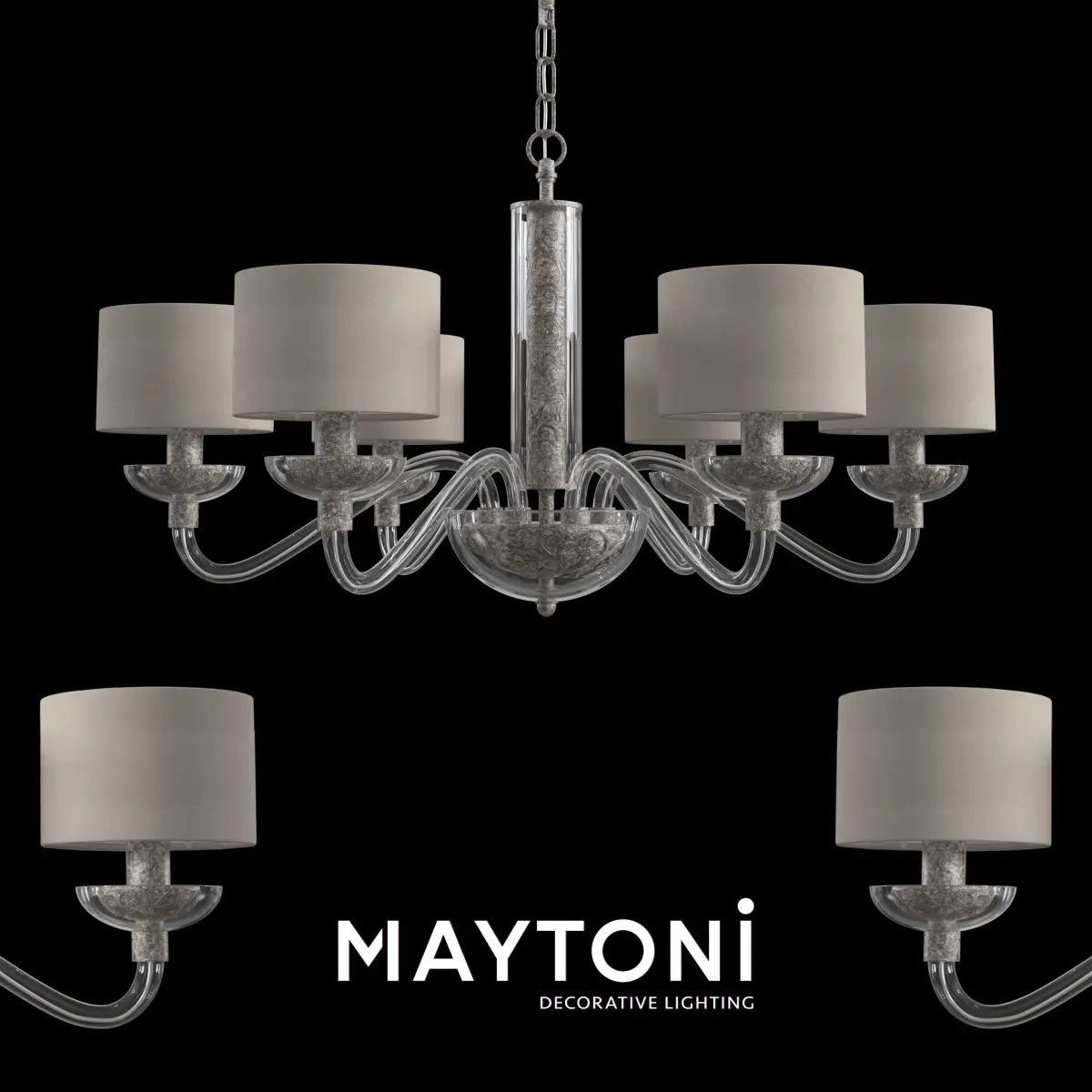 Chandelier Maryland ARM526PL-06GR Maytoni ClassicSeries: MarylandMetal frame. Combined body made of polyresin and transparent glass. PVC lampshade covered in cloth.Leuchte mit besonderer Materialwahl: der Körper aus Polyresin und transparentem Glas, Rahmen aus Metall. PVC-Lampenschirm mit Stoffbezug.Collection: ElegantStyle: Maytoni ClassicType of lamp: Chandelier Height, mm: 420Diameter, mm: 750Number of bulbs: 6Cap: E14Power: 40WFrame material: Polyesin, Glass + MetalColour: GreyMaterial of shade: Fabric