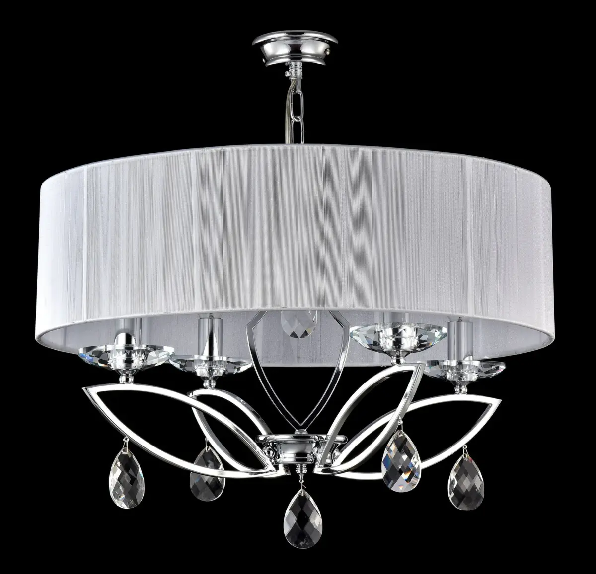 Series: MiraggioCollection: NeoclassicStyle: Maytoni ClassicType of lamp: ChandelierColour: ChromeLampshade diameter: 556Height, mm: 163Material of shade: OrganzaColour: WhiteFrame material: MetalHeight , mm: 470Height with suspension mount, mm: 950Diameter, mm: 555Number of bulbs: 4Cap: E14Power: 40W
