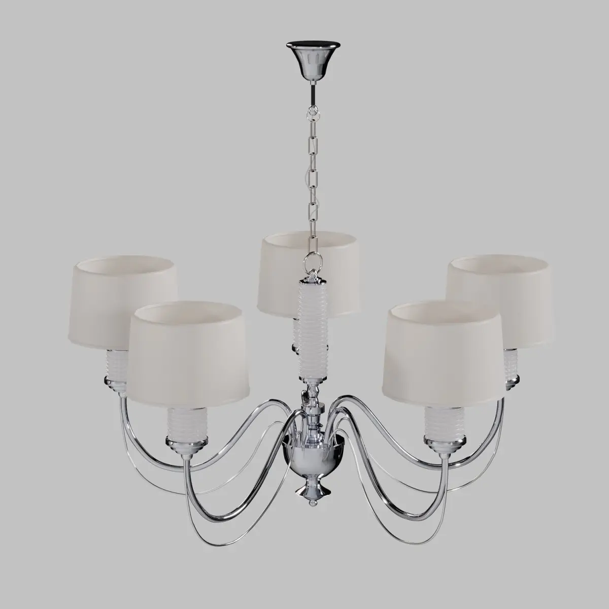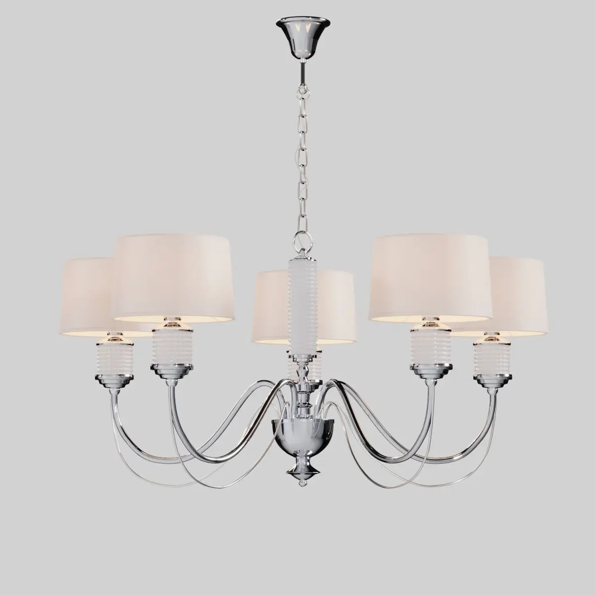 The Ontario chandelier is a stunning piece of art that combines metal, glass, and fabric to create a refined and elegant look. The metal base has a shiny chrome finish that reflects the light beautifully. The double arms and the central stem are adorned with clear glass beads that add texture and sparkle. The lampshades are made of white satin that has a silky shine and a heat-resistant acrylic layer to prevent fading. The satin diffuses the light softly and evenly, creating a cozy and inviting atmosphere. The Ontario chandelier is perfect for any room that needs a touch of sophistication, such as the living room, dining room, office, or cottage. It will complement any interior style that features modern, neoclassical, or art deco elements.