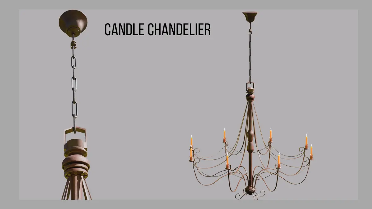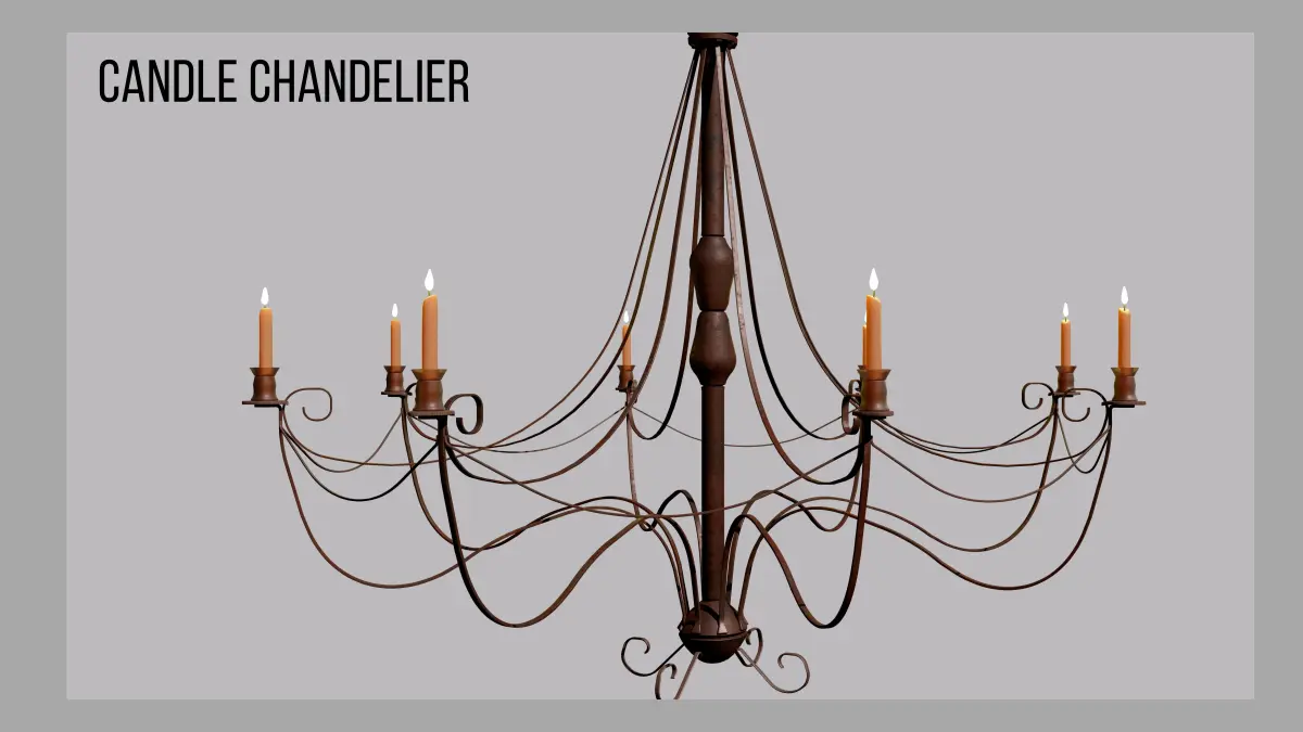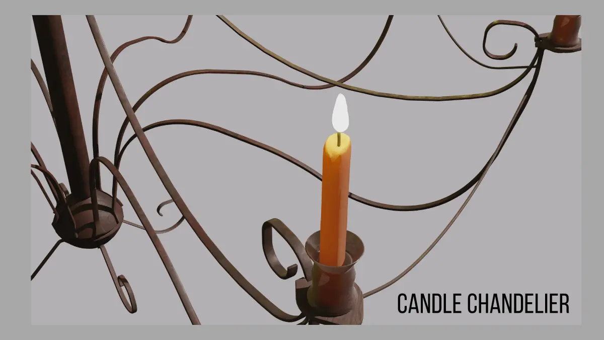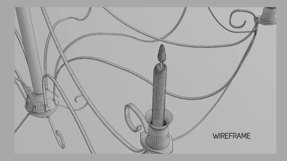 A medieval candle chandelier with an aged metal frame. This model is ideal for your compositions.Model without overlapping lines and revised mesh.The template mapped and ready to use. Compatible with Blender 2.90 or higher. Ready to use scene.