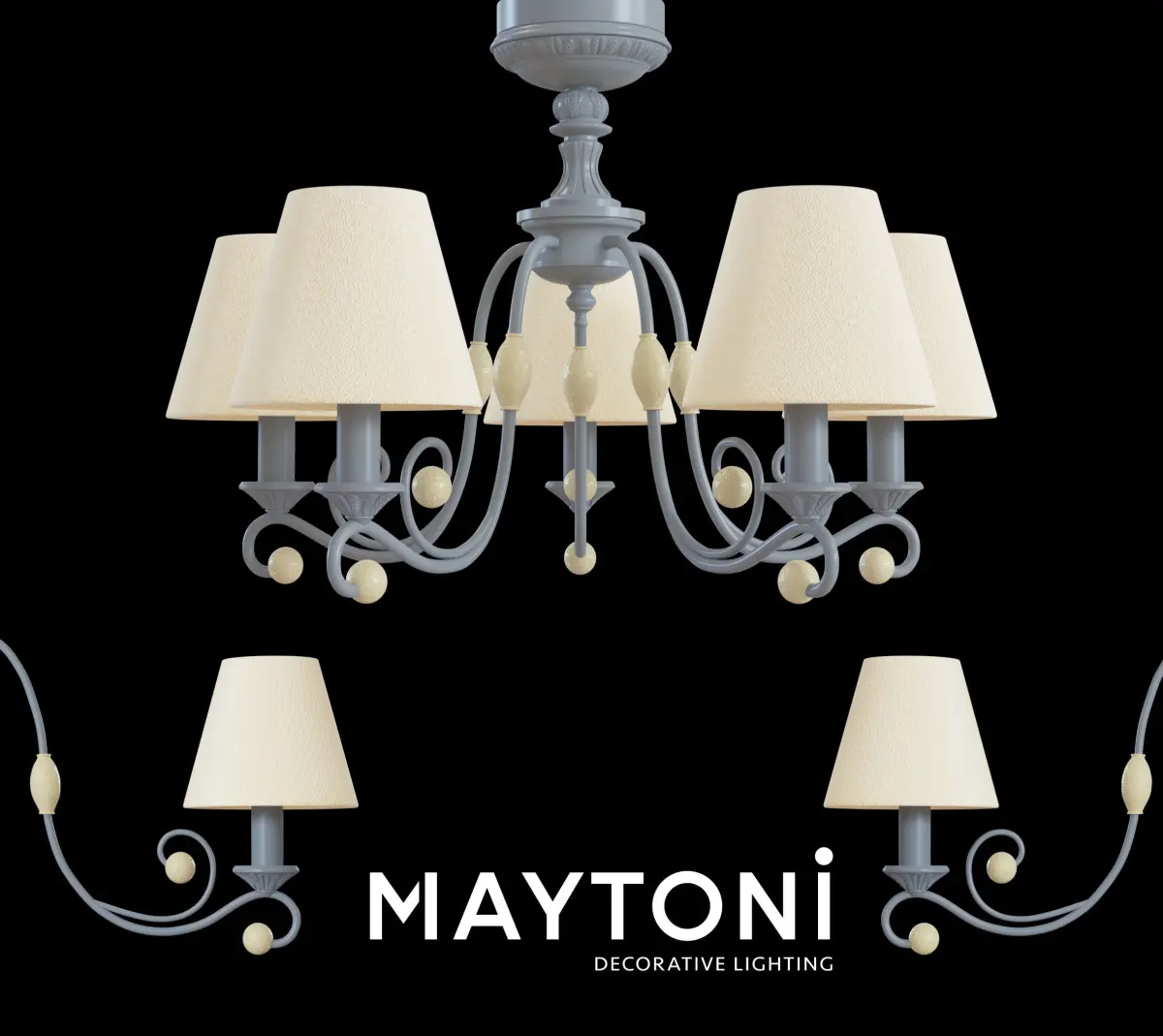 Chandelier Rebecca ARM355-PL-05-GR Maytoni ClassicSeries: RebeccaCollection: ElegantStyle: Maytoni ClassicType of lamp: ChandelierHeight, mm: 419Diameter, mm: 598Height with suspension mount, mm: 1 437Number of bulbs: 5Cap: E14Power: 40WFrame material: Metal + PolyesinColour: GreyMaterial of shade: Fabric on PVC