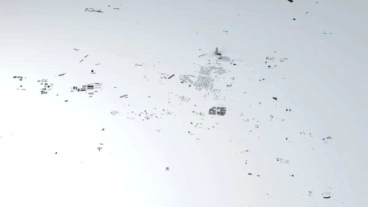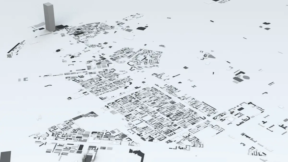 - the model is positioned on a flatv surface (all buildings are on the “floor” - no elevation data included)
