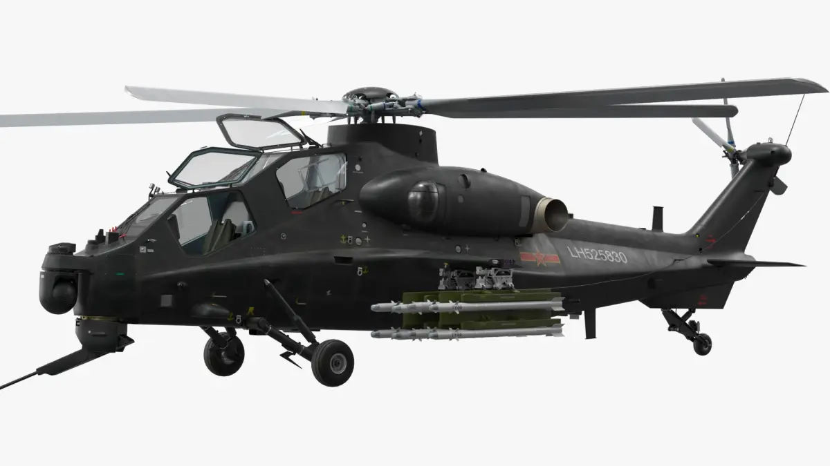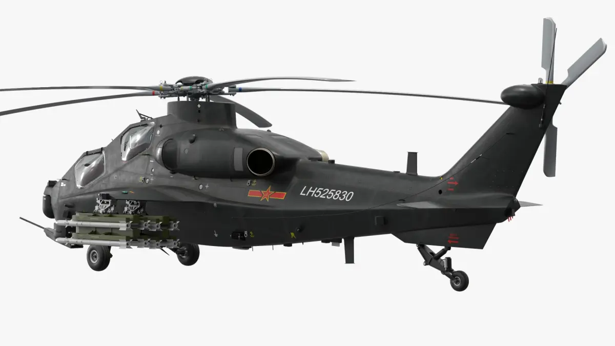 Changhe Attack Helicopter Z-10 with Rocket Loadout Black Rigged is a three-dimensional model of the Chinese Z-10 combat helicopter, presented in an all-black tactical finish and equipped with a detailed rocket and missile payload.