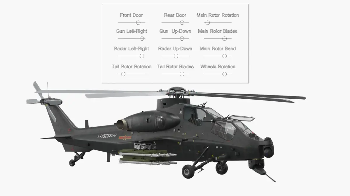 Changhe Attack Helicopter Z-10 with Rocket Loadout Black Rigged is fully rigged and is ready to be animated. You can easily position it the way you need or animate it the way your project requires using helpers in 3D Studio Max. See the turntable to get an idea of how rigging works.