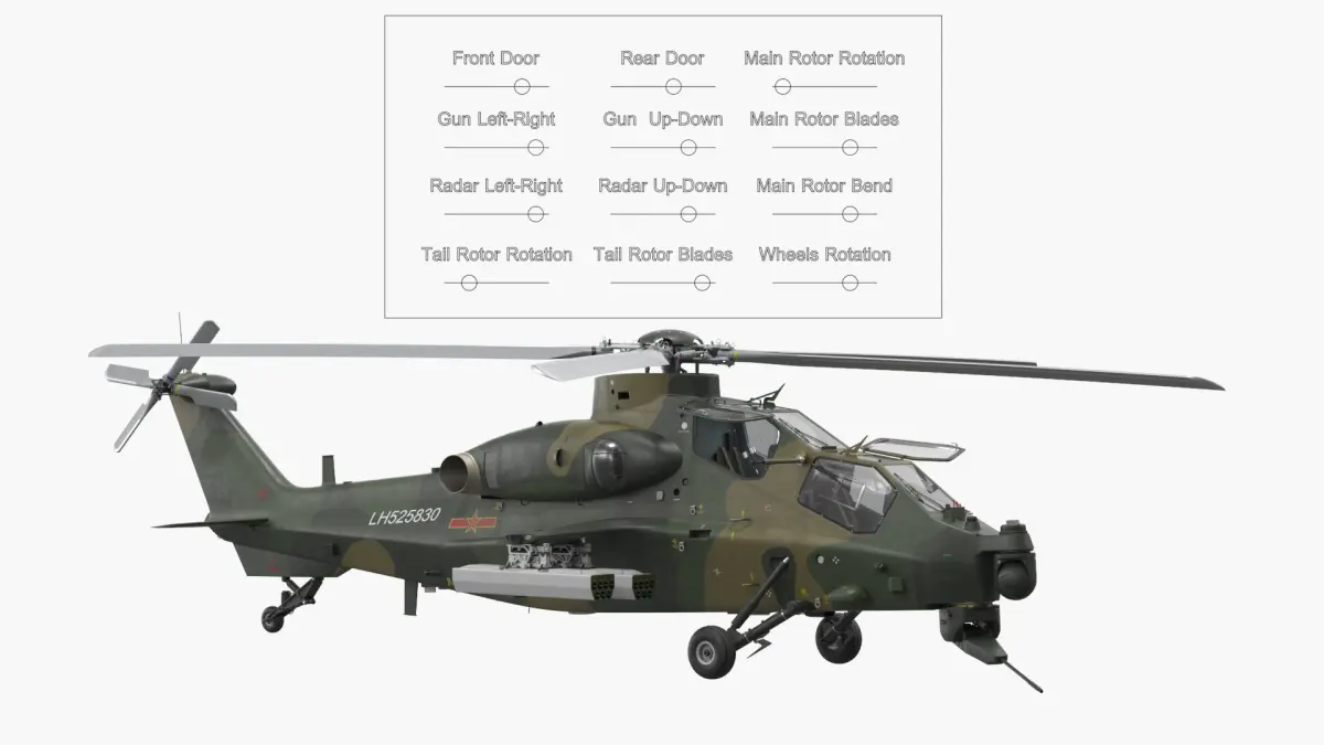 Changhe Z-10 Helicopter with Rockets Fire Snake 70A Rigged is fully rigged and is ready to be animated. You can easily position it the way you need or animate it the way your project requires using helpers in 3D Studio Max. See the turntable to get an idea of how rigging works.