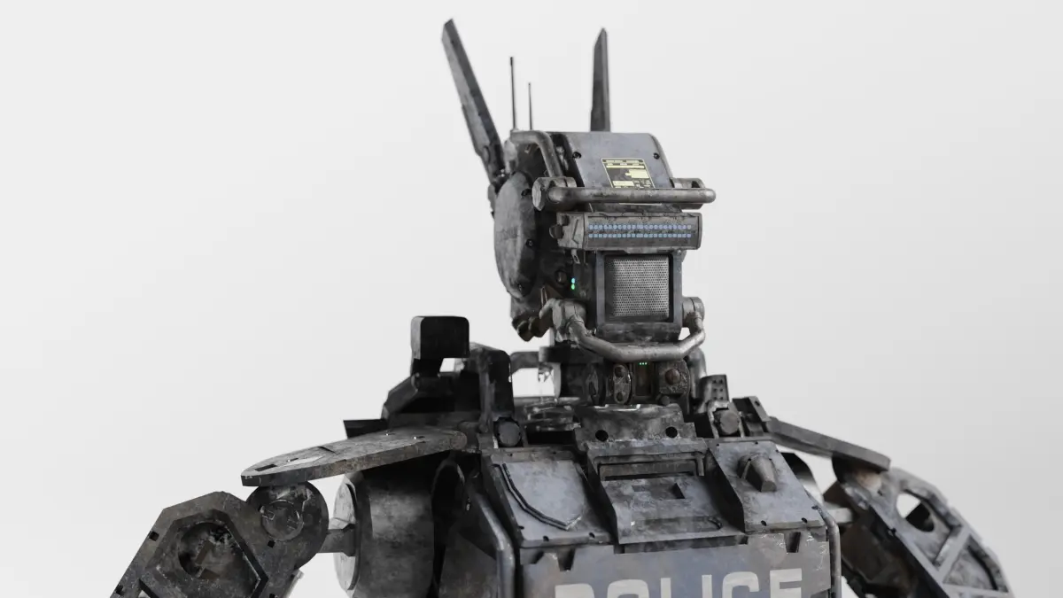 This model captures a futuristic aesthetic, featuring detailed armor plating, sleek police-themed decals, and a distinctive design inspired by Chappie, the sentient robot.