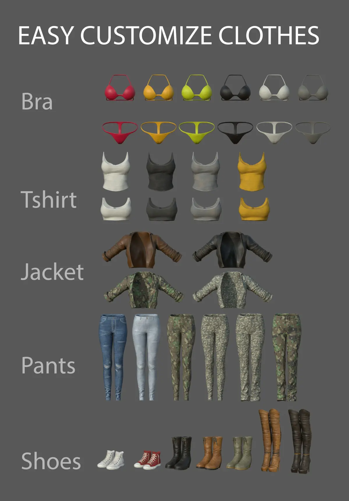 ** - This Bundle included 1 body female with eyes, eyelash, hair, teeth, tongue, and 5 parts to easy customize (6 bra,8 tshirt, 4 jacket, 6 pants, and 7 shoes)**