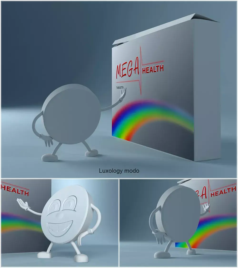 Conceptual 3D illustration of a Pill Character and its Packaging.