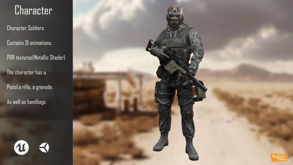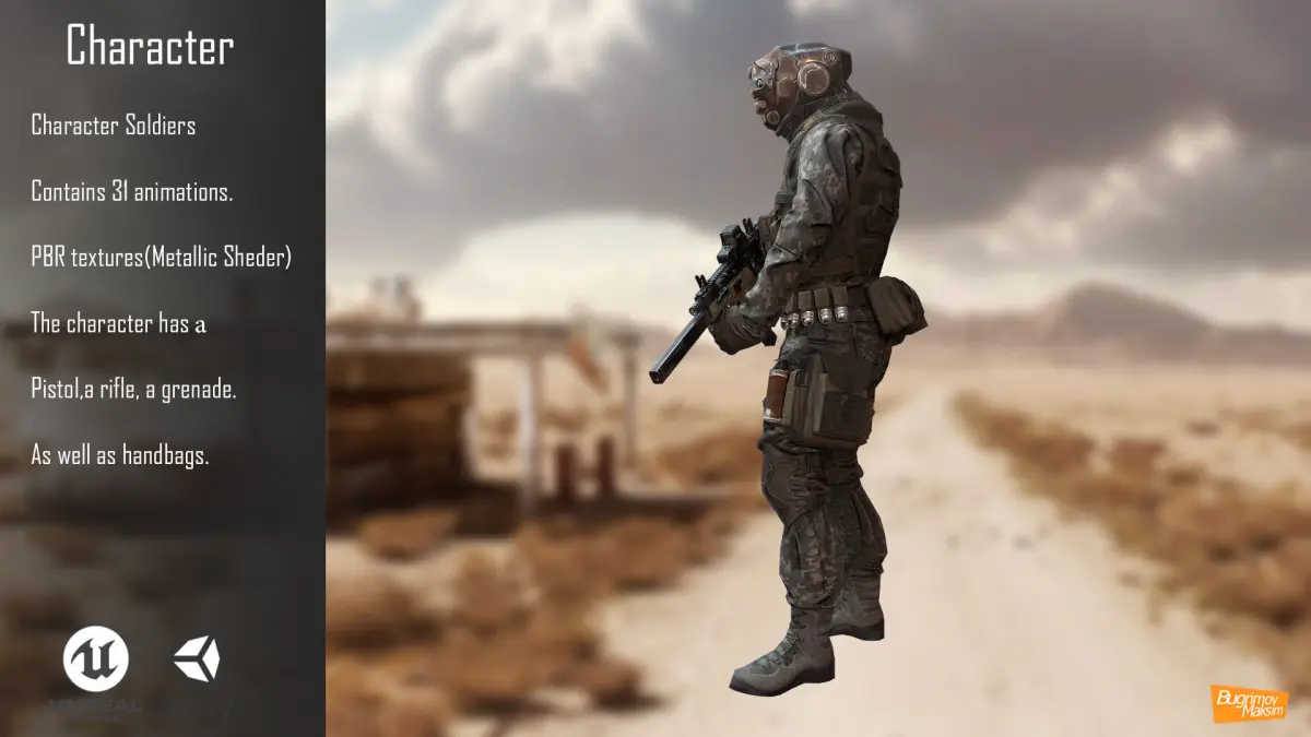 The character is updated and has an Epic Skeleton for UE4PBR textures(Metallic Sheder)The character has to Arms.Pistols,Tommy-gun, grenade.As well as handbags.