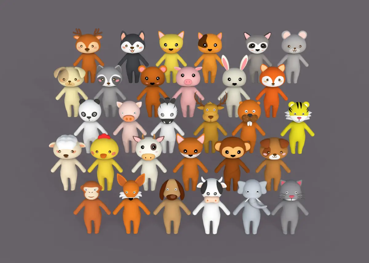 The Character002 Little Animal Pack 3D model is a comprehensive collection featuring 30 charming and cartoon-style animal face models. This pack is designed to cater to various creative projects such as games, augmented reality (AR), virtual reality (VR), web applications, cartoons, and video rendering.
