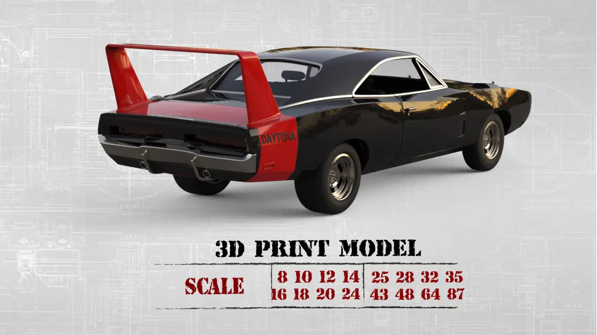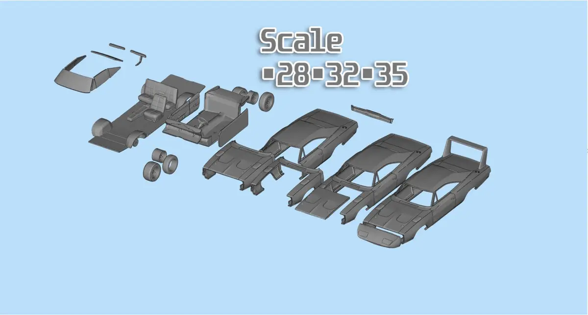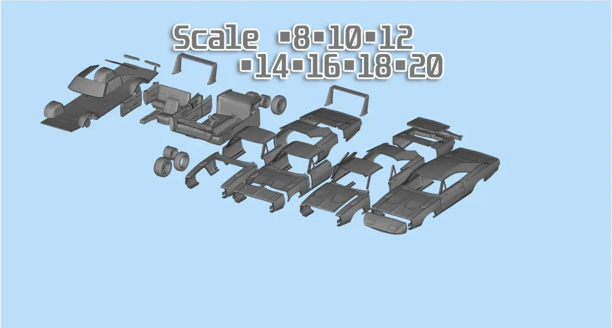 Large scales can use FDM printing. Small scale - resin. Specs: •1:8 •1:10 •1:12 •1:14 •1:16 •1:18 •1:20 •1:24 •1:25 •1:28 •1:32 •1:35 •1:43 •1:48 •1:64 •1:87The model includes: • Body • Interior • Chassis parts • Wheels • Tires • Windows and glasses