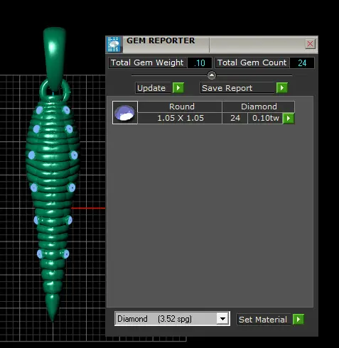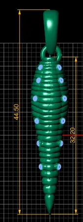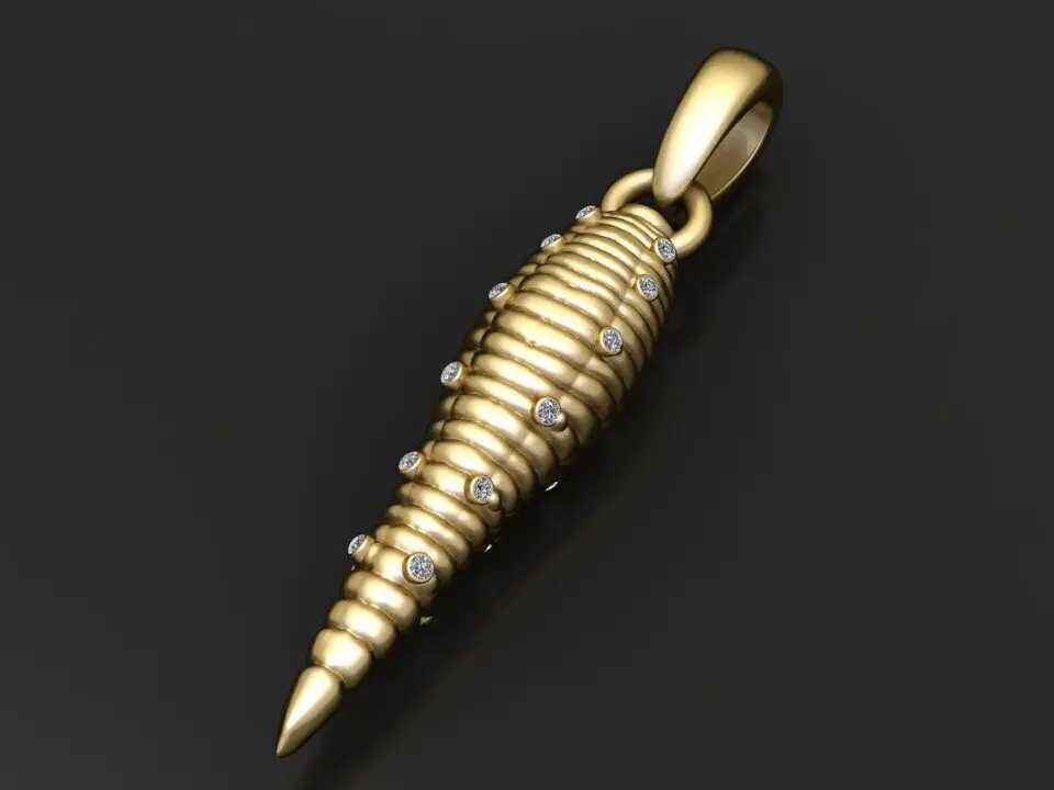 This exquisite 3D printable pendant design features a sleek, tapered form resembling a stylized horn, fang, or drill. Crafted in a polished gold finish, the surface is segmented with a ribbed texture, giving it an organic and futuristic look. Scattered across the body are small, shimmering gemstones that add a luxurious sparkle and visual rhythm. The solid bail loop ensures a secure and elegant attachment. This pendant blends elegance with bold design, making it perfect for statement jewelry lovers or fantasy/sci-fi inspired collections