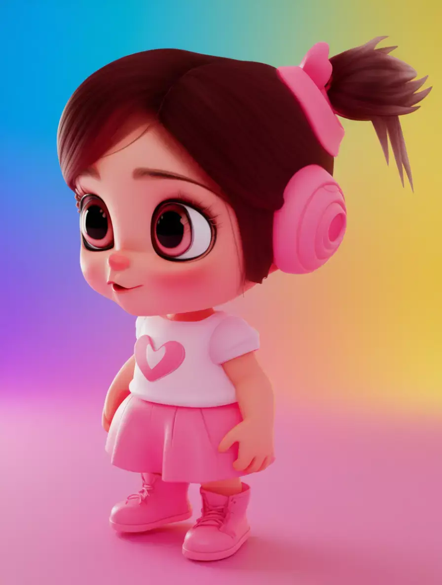 This 3D model features a cute cartoon puppy with large expressive eyes, rosy cheeks, and floppy ears, wearing green overalls over a white shirt. The character’s soft, rounded features and friendly smile evoke warmth and playfulness. Ideal for children’s content, animation, or as a collectible digital asset. Key attributes: