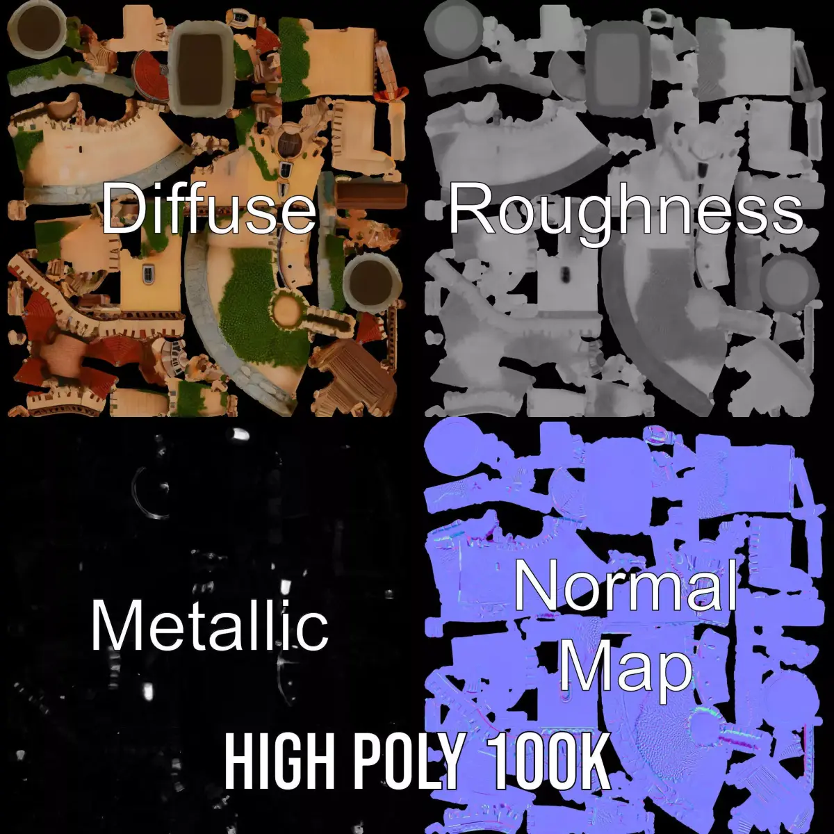 This charming castle 3D model is perfect for bringing medieval settings to life. Each model has 3 levels of detail: low-poly (1000 triangles for mobile), middle-poly (10,000 triangles for environments), and high-poly (100,000 triangles), which allows for the use of this model in production rendering—such as 3ds Max, Maya, Cinema4D, Blender, Vray/Corona/Cycles—and all other game engines (Unity and Unreal compatible), and interactive presentations. This provides a choice of detail based on the LOD System principle. The model's textures are PBR, including Diffuse, NormalMap, and reflection/roughness/metallic, suitable for any modern rendering engine. All models are accurately unwrapped and have no overlapping UV. Perfect for use in historical animations, fantasy games, and virtual tours, these models provide immense versatility. All textures are 4096*4096 in size. Please like and leave a comment if you enjoyed this model.