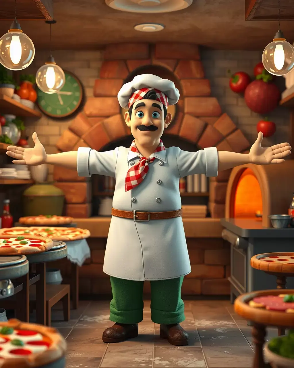 Introducing the Charming Italian Chef model pack, a delightful 3D character model perfect for enriching your culinary or restaurant-themed projects. The chef is depicted with a classic white outfit, complete with a checkered scarf and hat, embodying the traditional Italian pizzeria ambiance. This model is excellent for animations, advertisements, or educational purposes where a warm and welcoming chef is needed.