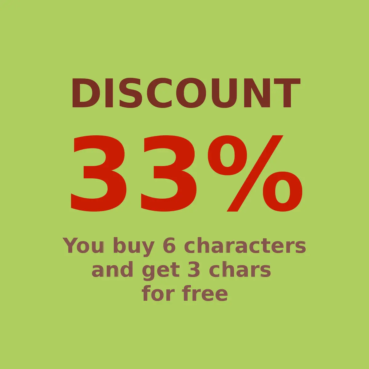 You pay for 6 characters and get 3 characters for free.You pay 114 USD instead 171 USD & save 57 USD.You get 9 characters with discount 33%.