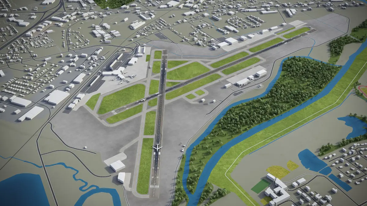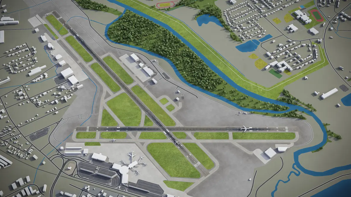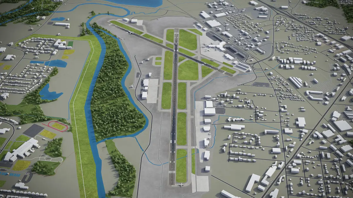 This is exact and accurate to-scale 3D model of Chattanooga Airport and its surrounding area based on GIS data (October 2021)