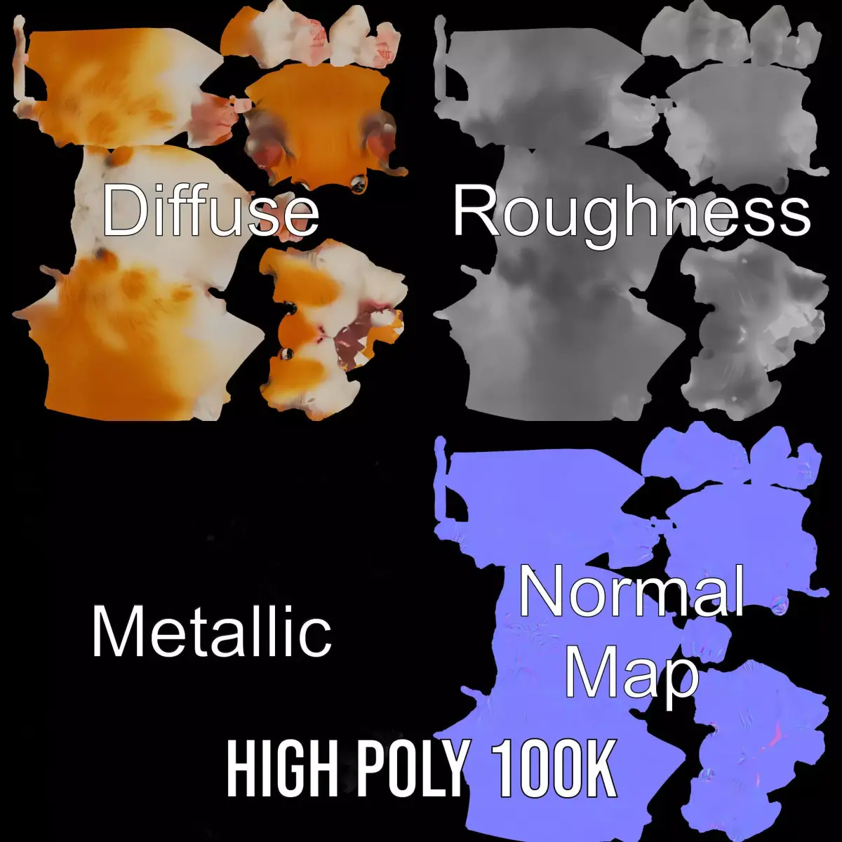 This adorable and detailed hamster model captures the charming essence of this cute rodent, perfect for animations, games, and virtual reality projects. Its expressive features and realistic fur make it a delightful addition to any digital scene. Each model has 3 levels of detail: low-poly (1000 triangles for mobile), middle-poly (10,000 triangles for environments), and high-poly (100,000 triangles), which allows for the use of this model in production rendering (such as 3ds Max, Maya, Cinema4D, Blender, Vray/Corona/Cycles and all others), game engines (Unity and Unreal compatible), and interactive presentations, providing a choice of detail based on the LOD System principle. The model's textures are PBR, Diffuse, NormalMap, and reflection/roughness/metallic, which are suitable for any modern rendering engine. All models accurately unwrapped and have no overlapping UVs. All textures are 4096*4096 in size. Please like and leave a comment if you enjoy this model!