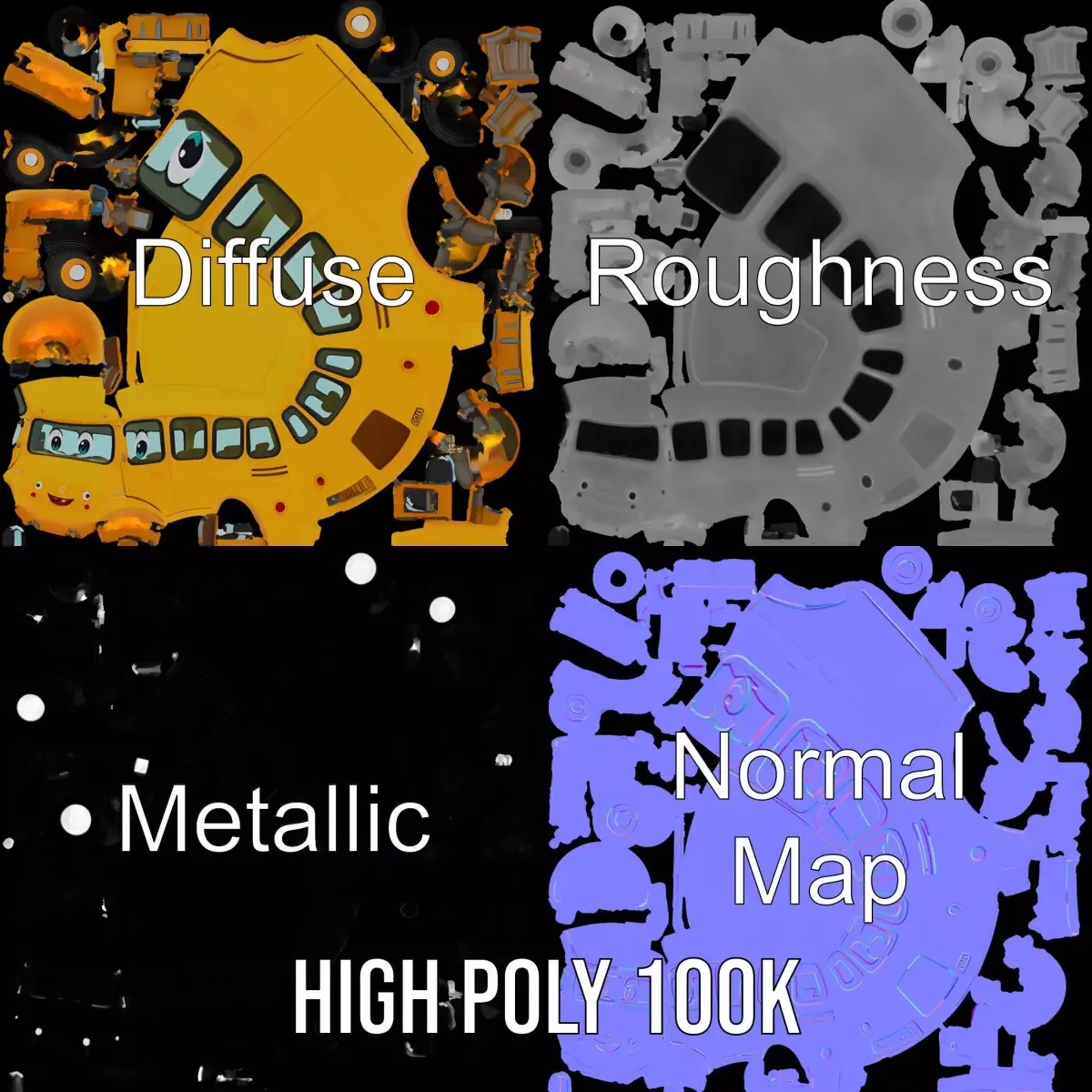 Brighten your scene with this Cheerful Yellow Bus model pack, featuring a playful and vibrant design that is perfect for animation and educational content. Each model has 3 levels of detail: low-poly (1000 triangles for mobile), middle-poly (10,000 triangles for environment), and high-poly (100,000 triangles), which allows for the use of this model in production rendering (such as 3ds Max, Maya, Cinema4D, Blender, Vray/Corona/Cycles and all others), game engines (Unity and Unreal compatible), and interactive presentations, providing a choice of detail based on the LOD System principle. Ideal for use in children's animations, interactive games, and VR simulations, this model is sure to engage young audiences. The model's textures are PBR, Diffuse, NormalMap, and reflection/roughness/metallic, which are suitable for any modern rendering engine. All models are accurately unwrapped and have no overlapping UVs. All textures are 4096*4096 in size. If you like the model, please give it a like and leave a comment!