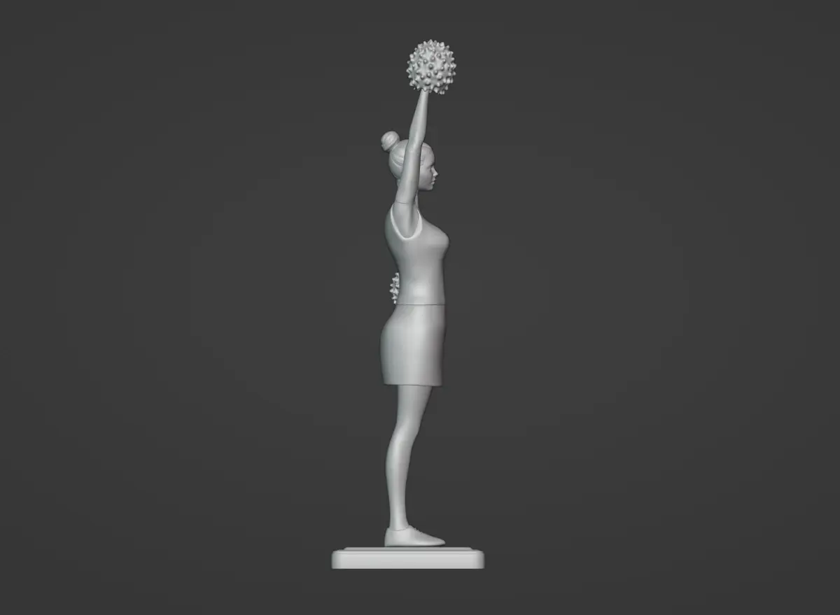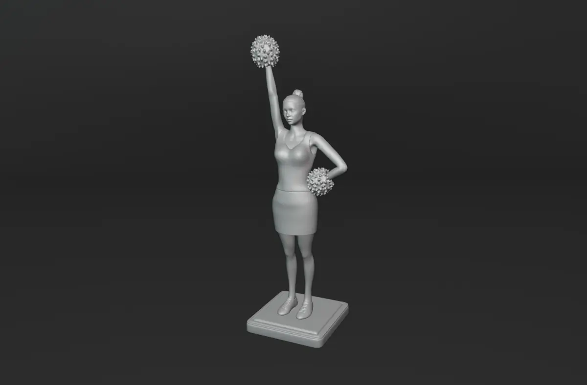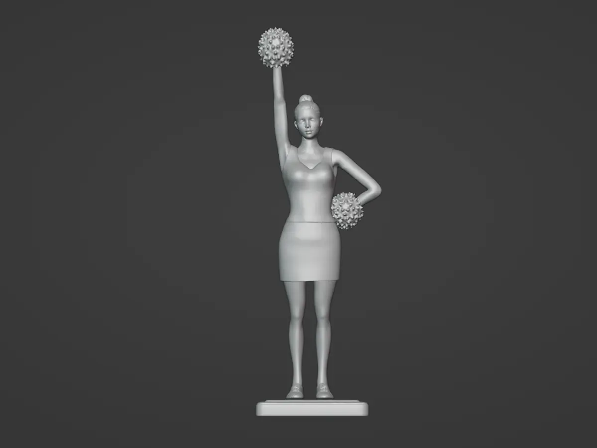 This is a 3d model of a cheerleader in a skirt, striking a confident pose on a base. One hand rests on her waist, while the other lifts a pom-pom mid-cheer. Ready for 3d printing.