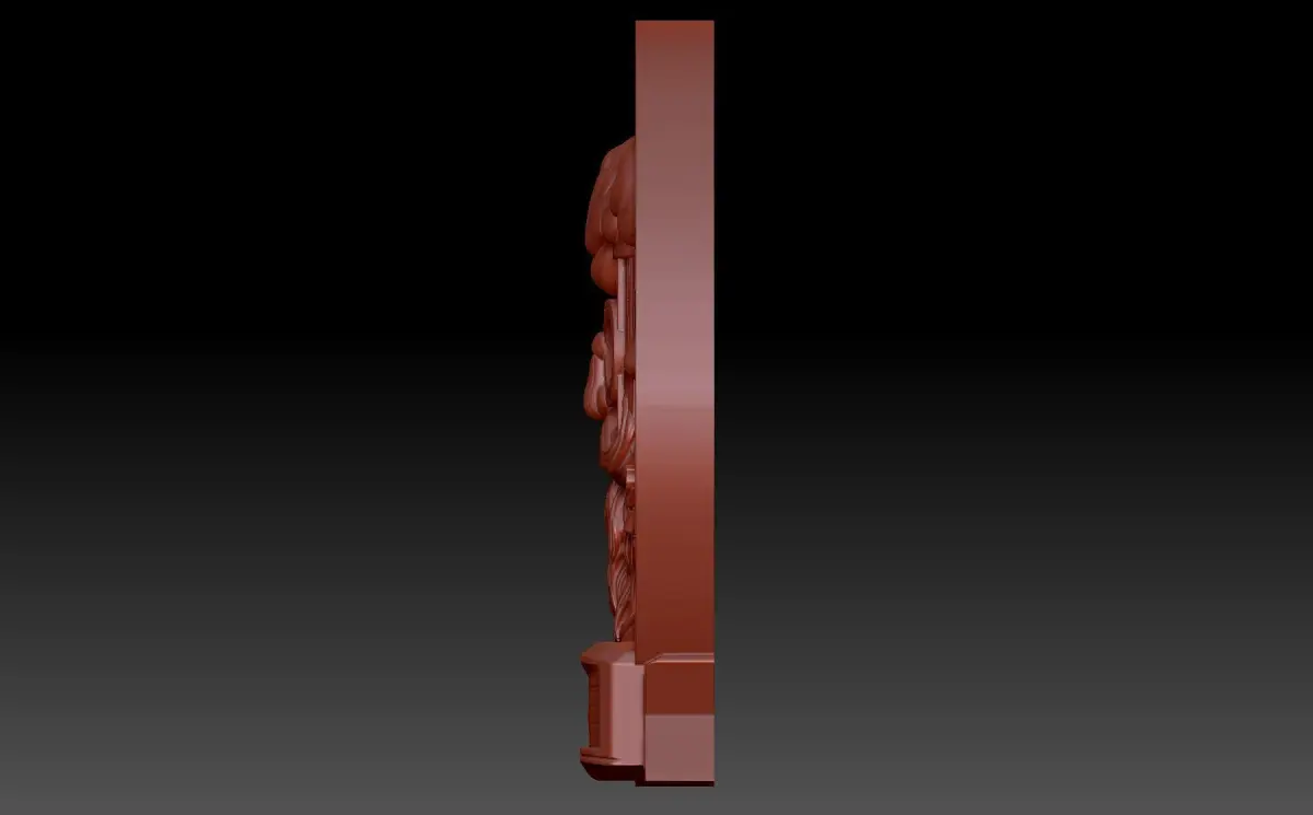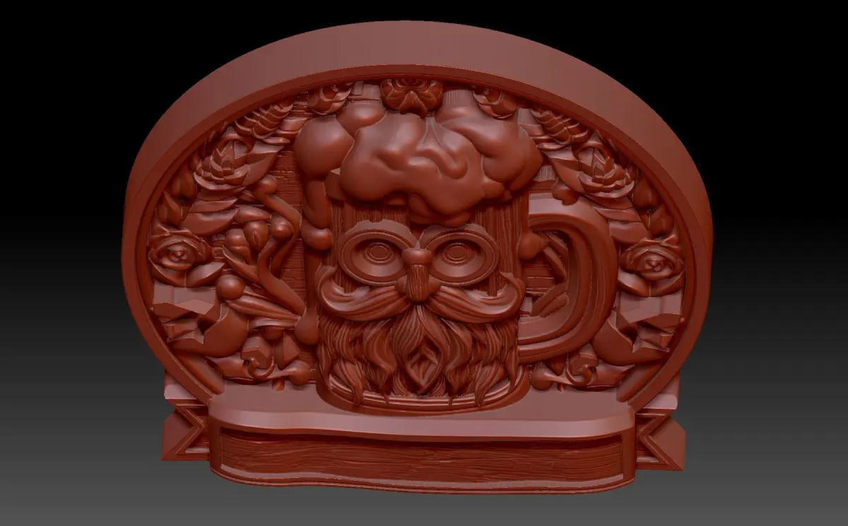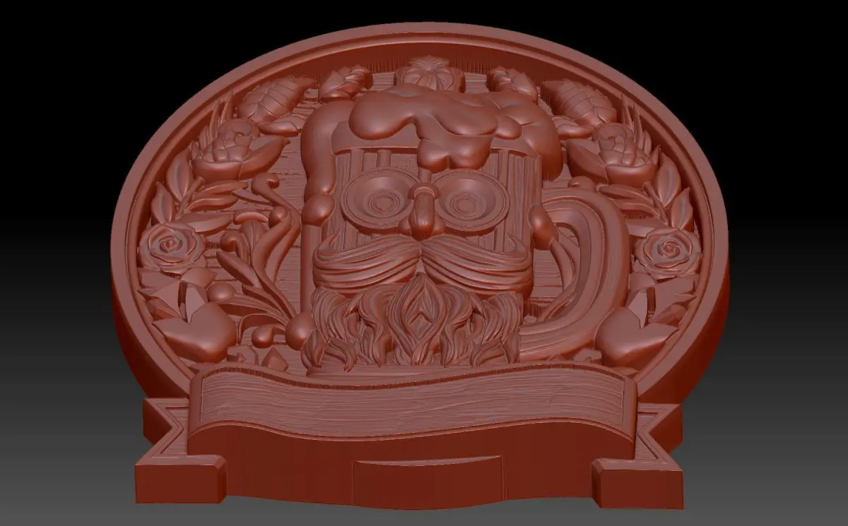 A 3D model of a bas-relief depicting a beer mug with a mustache and glasses. The background is filled with decorative elements, which gives the composition a more interesting look. The work will be done for 3d printing and CNC machine.