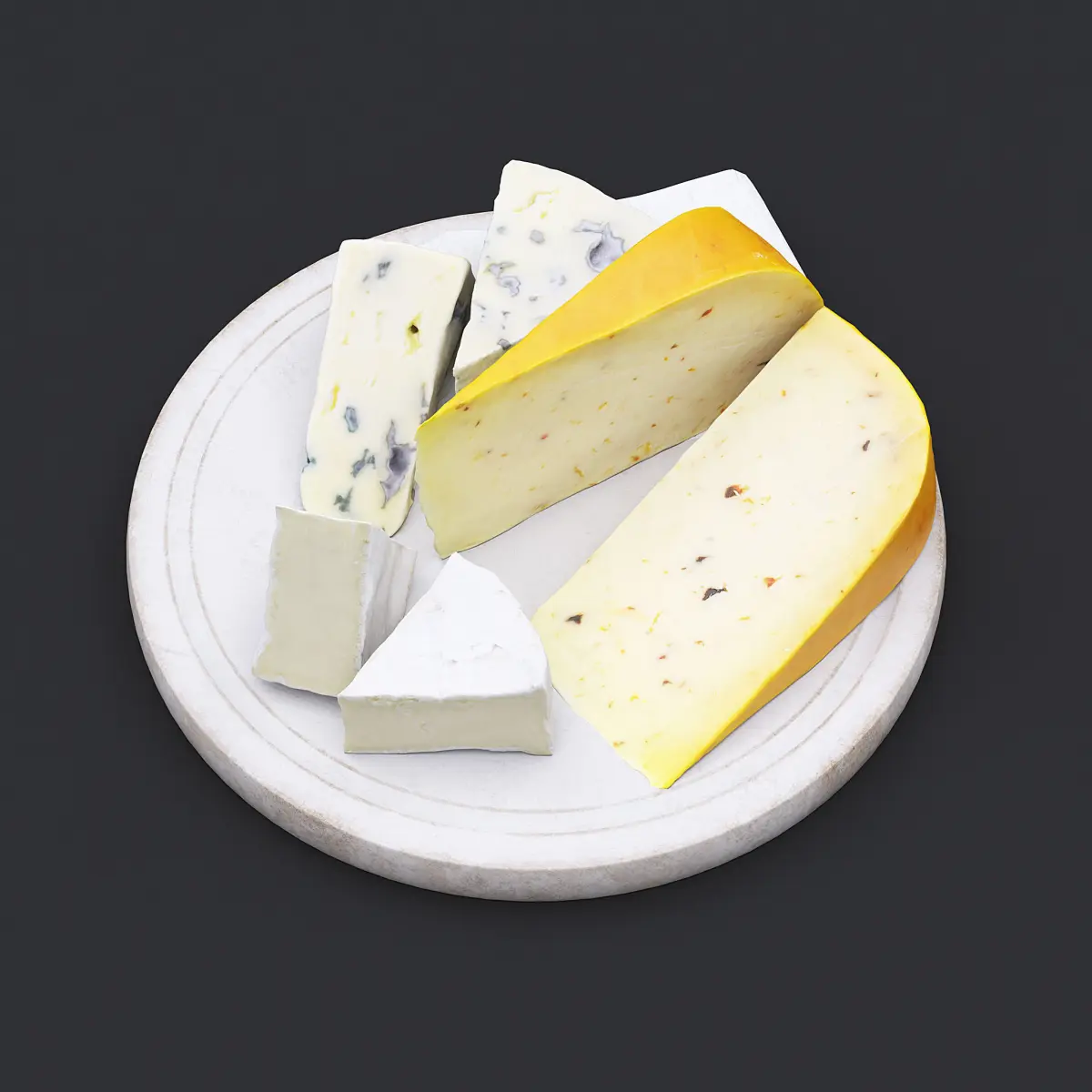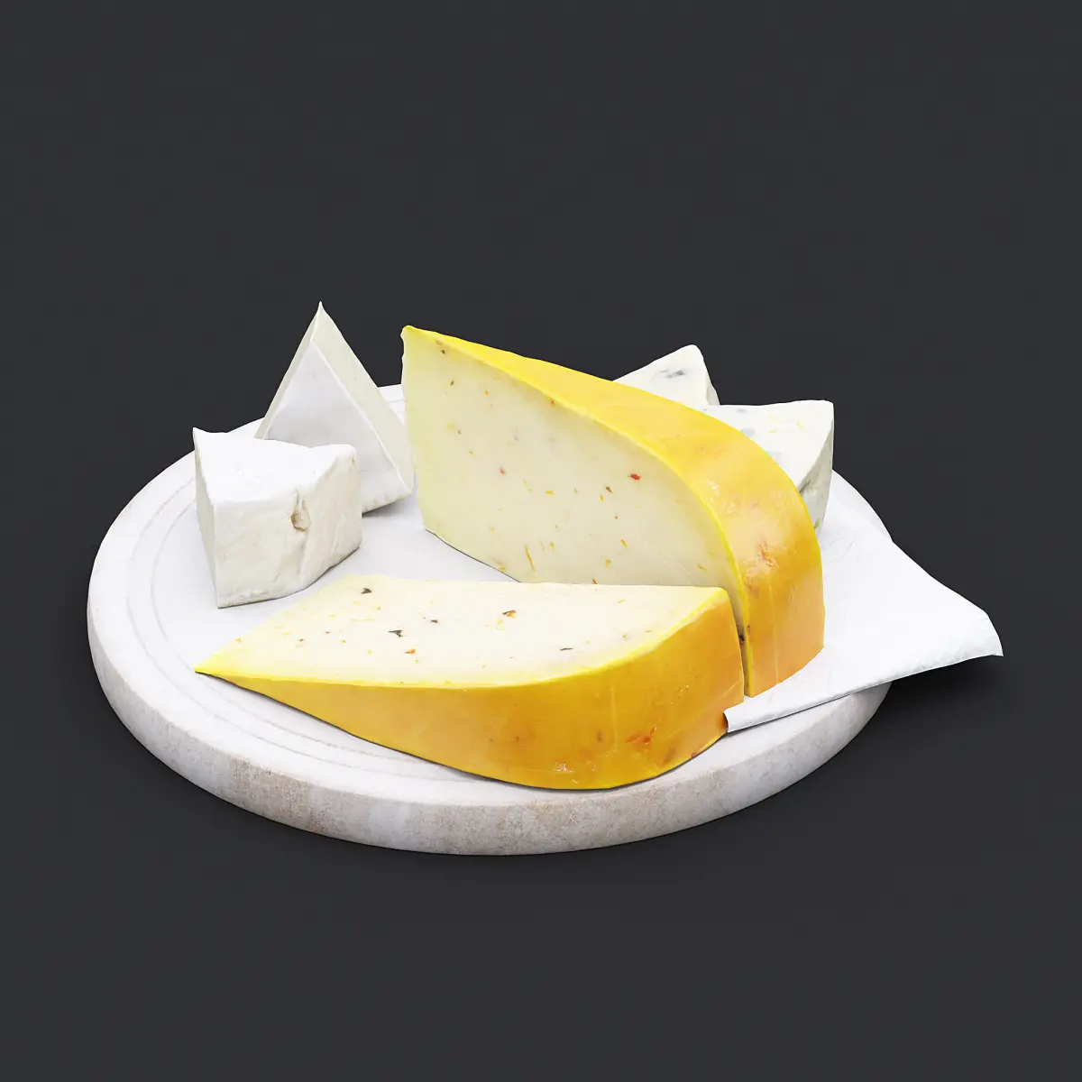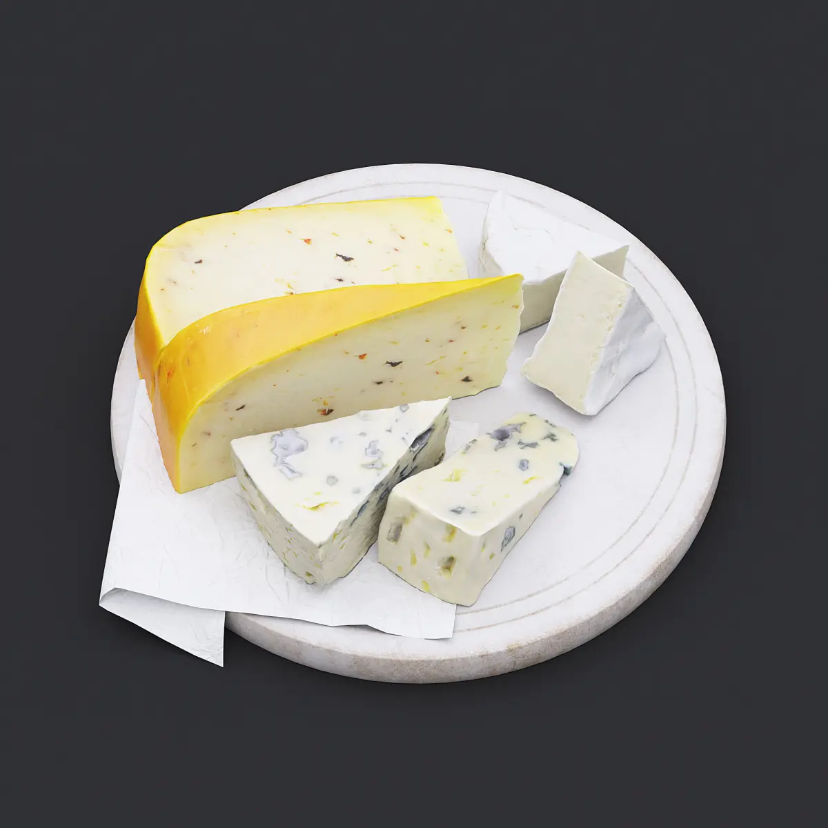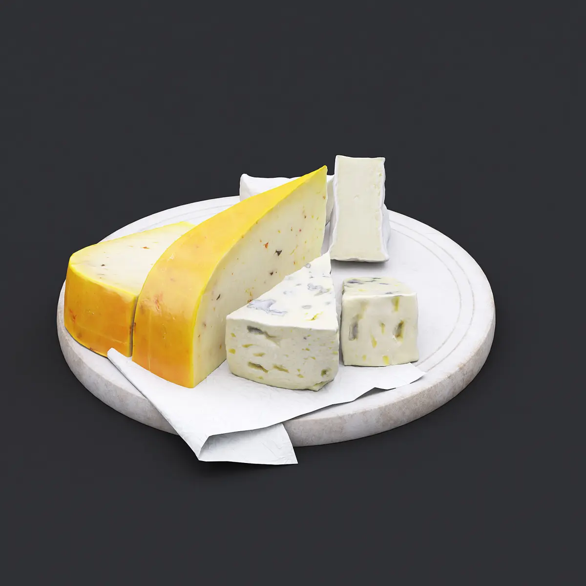 White wooden board with a paper napkin and photogrammetry scanned three types of cheese: gouda with spices, camembert and blue cheese.