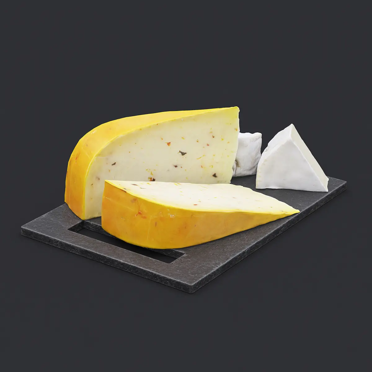 Black stone board with two types of photogrammetry scanned cheese: gouda with spices and camembert.