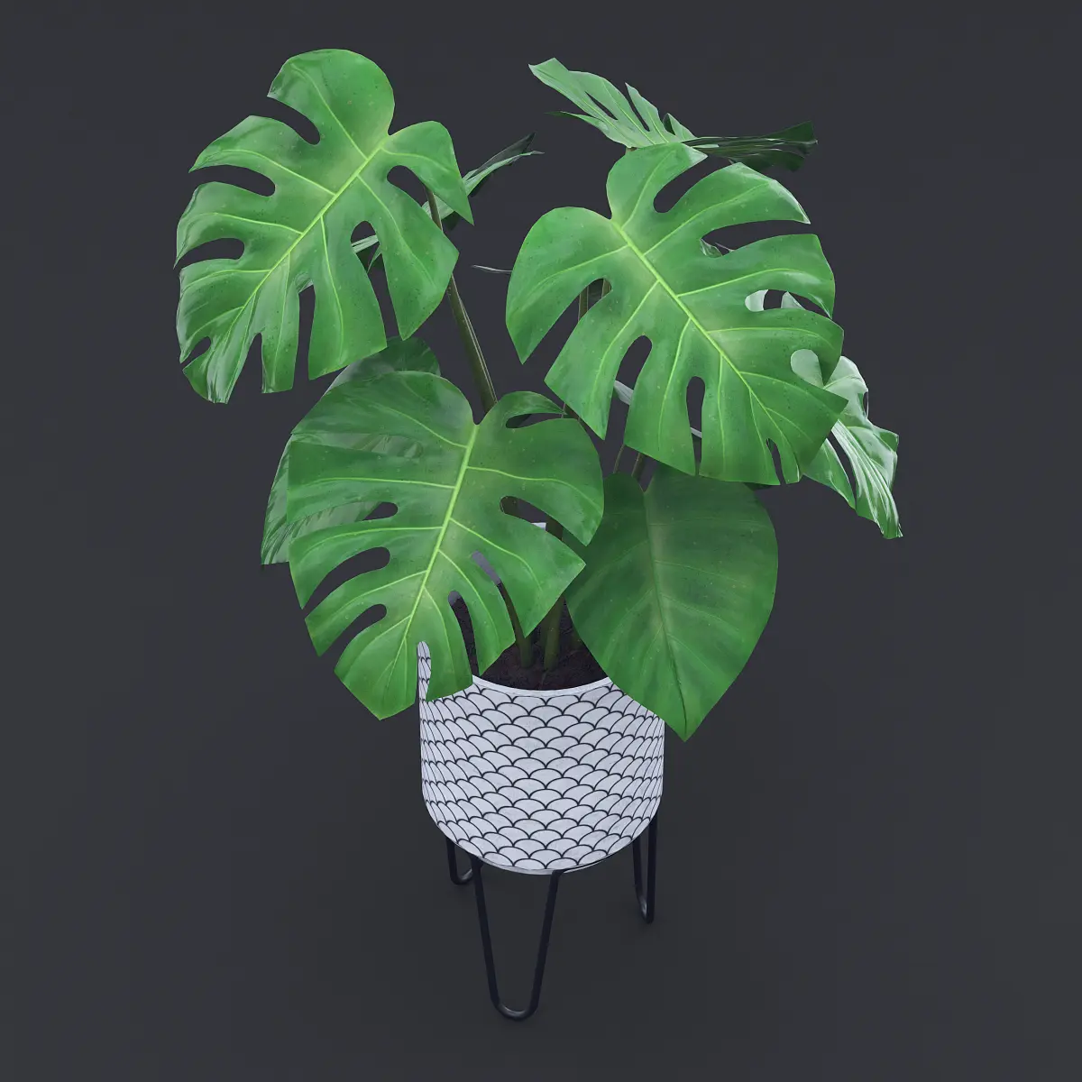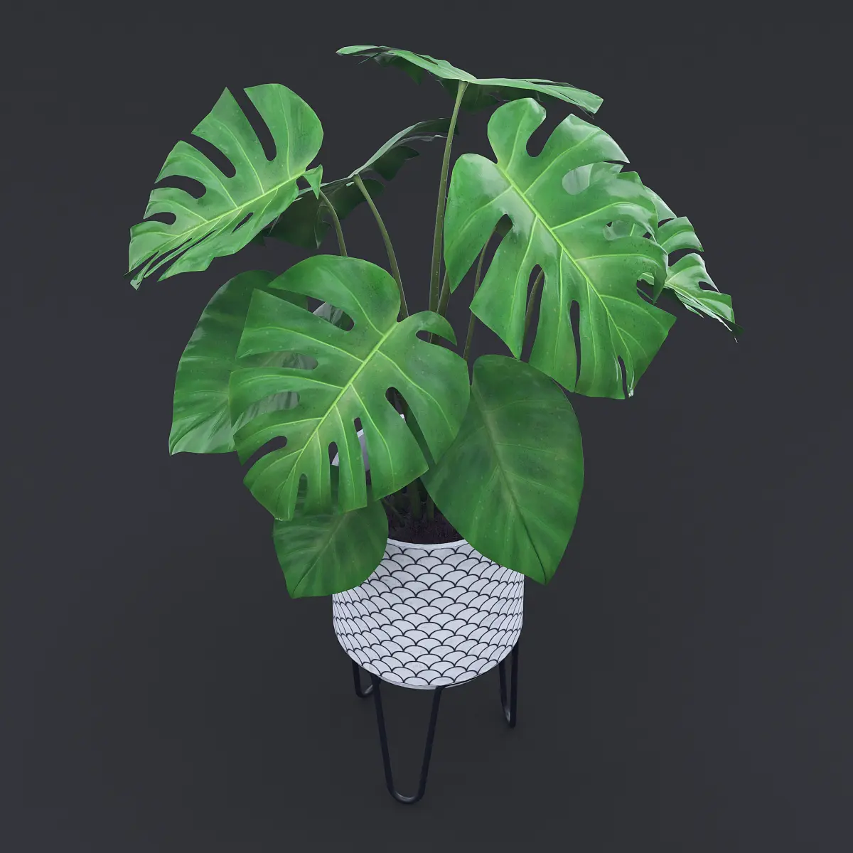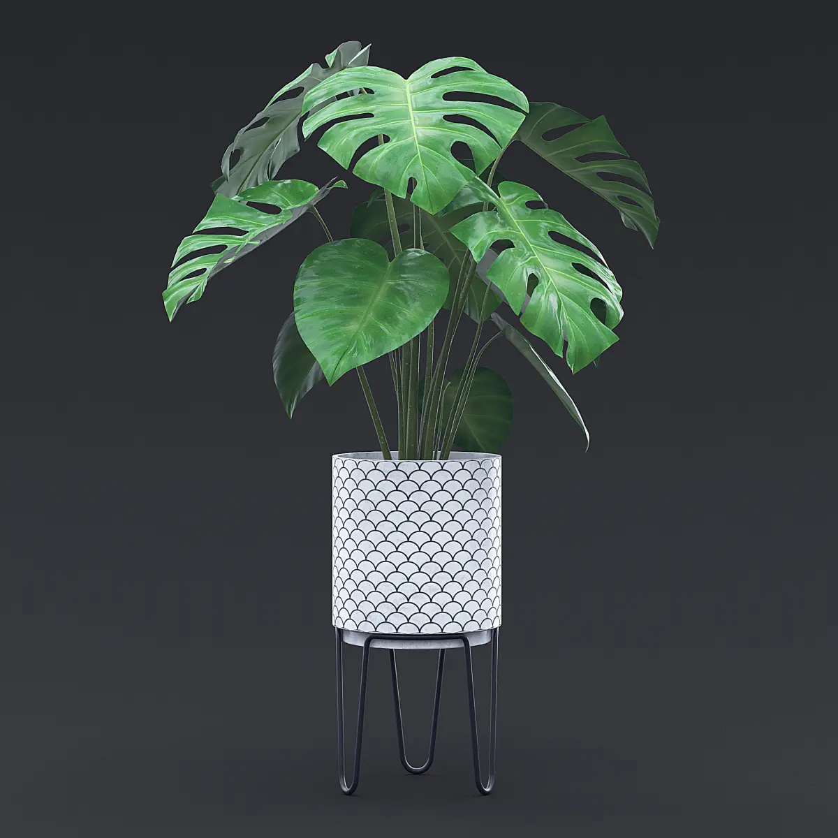 Cheese Plant - Monstera Deliciosa in a white ceramic pot on a black wire stand.