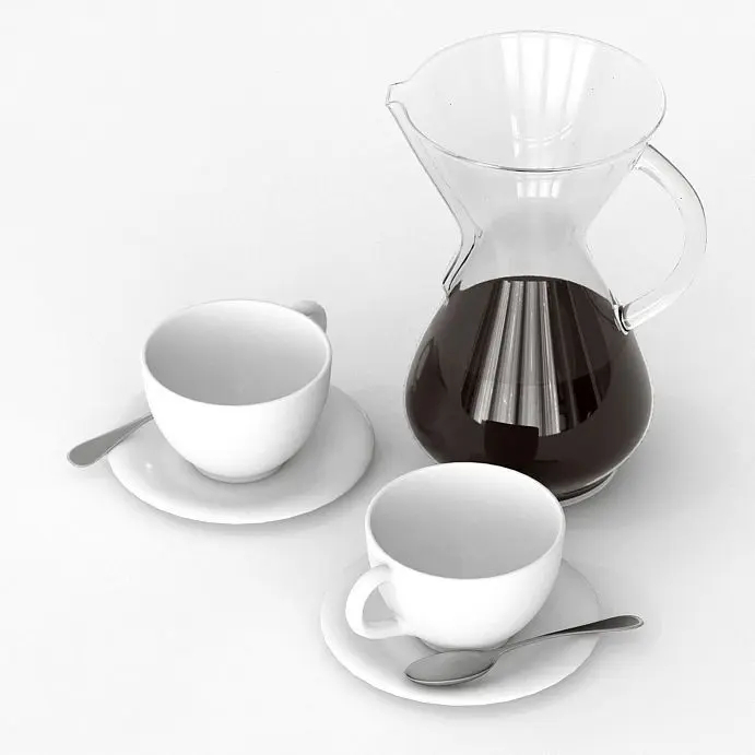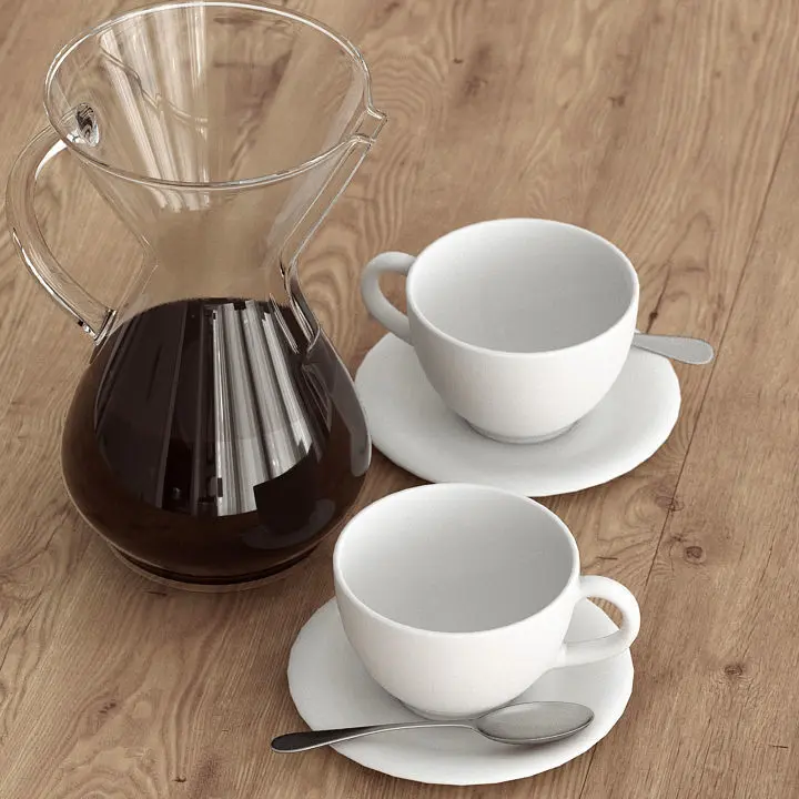 Realistic model of chemex with coffee and coffee cups with spoons. Optimized polycount, real scale, render-ready model.