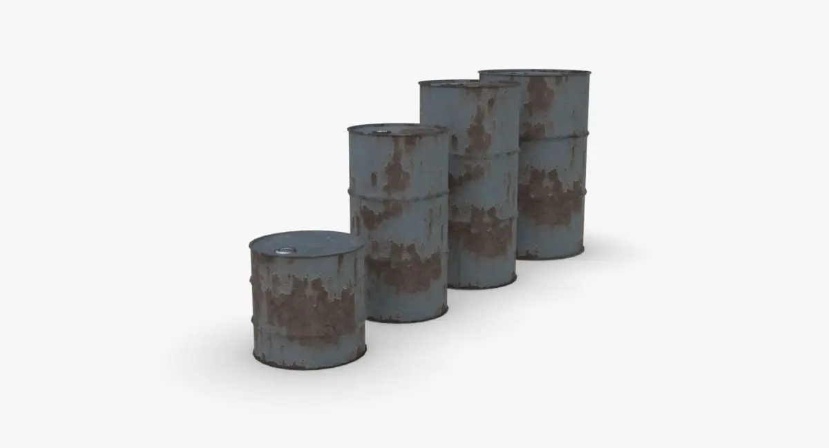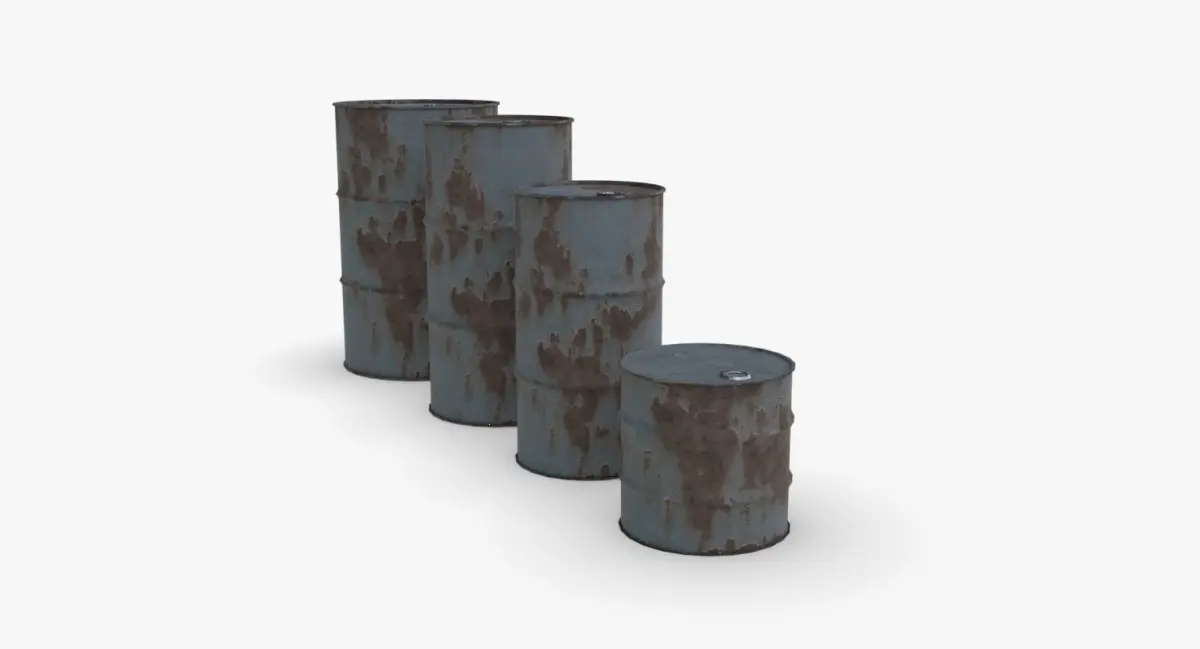 A model of 4 metallic barrels. The model is ready for game and include 3 LODs and a single material for each variation. It is available in a single object for each variation and each LOD. The material represent a grey painted version with big rust rings. The variations of size are :