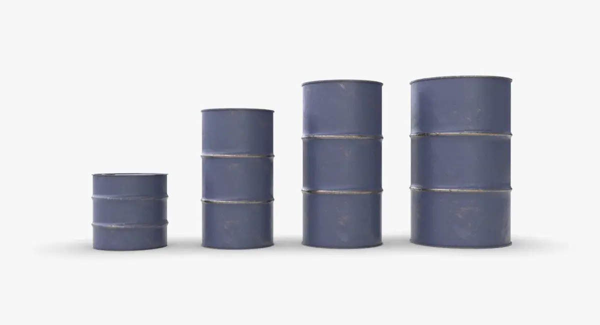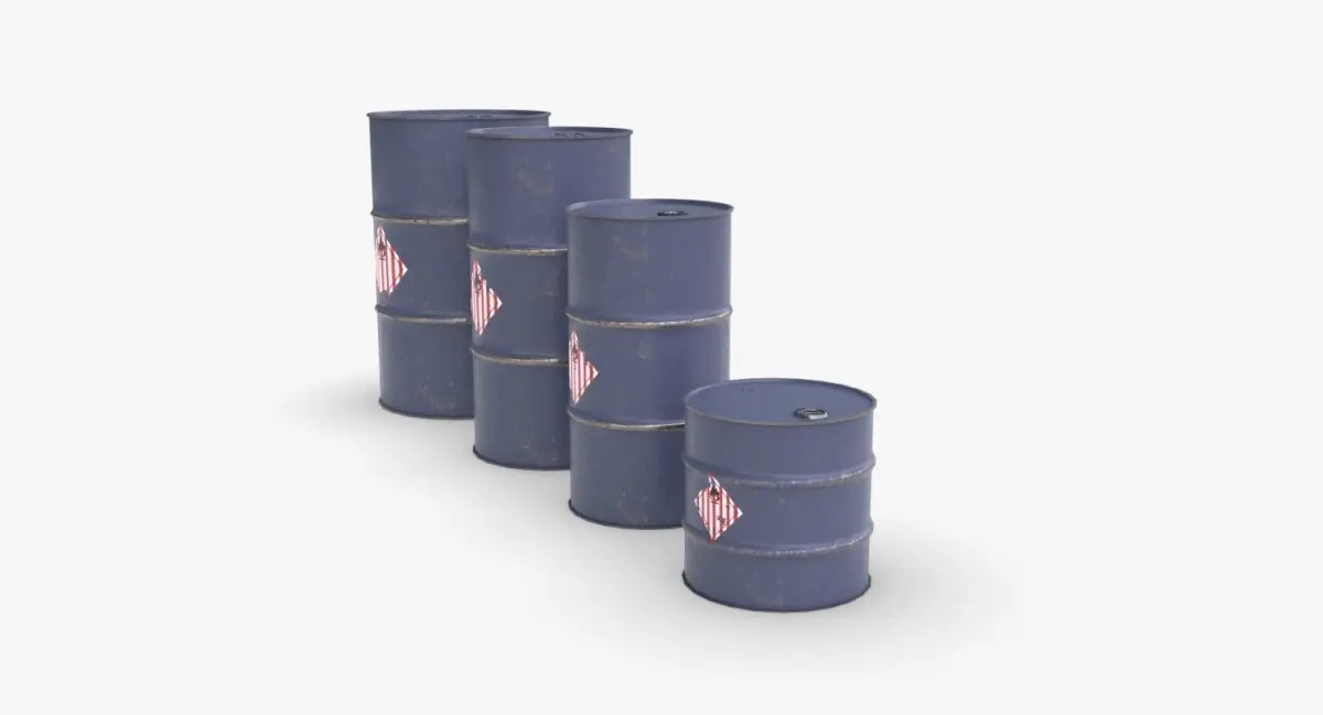 A model of 4 metallic barrels. The model is ready for game and include 3 LODs and a single material for each variation. It is available in a single object for each variation and each LOD. The material represent a blue painted version with a flamable solid sign sticked on it. The variations of size are :
