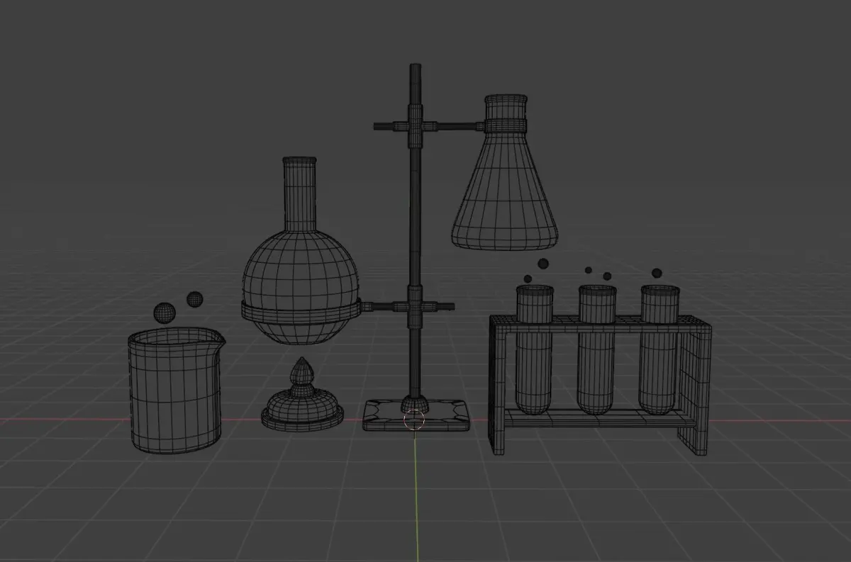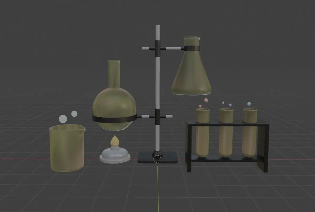 Chemical Elements or Science Experiment Equipment include Erlenmeyer Flask, Beaker, Boiling Flask, Test Tube, Measuring Cylinder.Low polygon with material and light set-up in the file. Create by Blender version 4.0.2