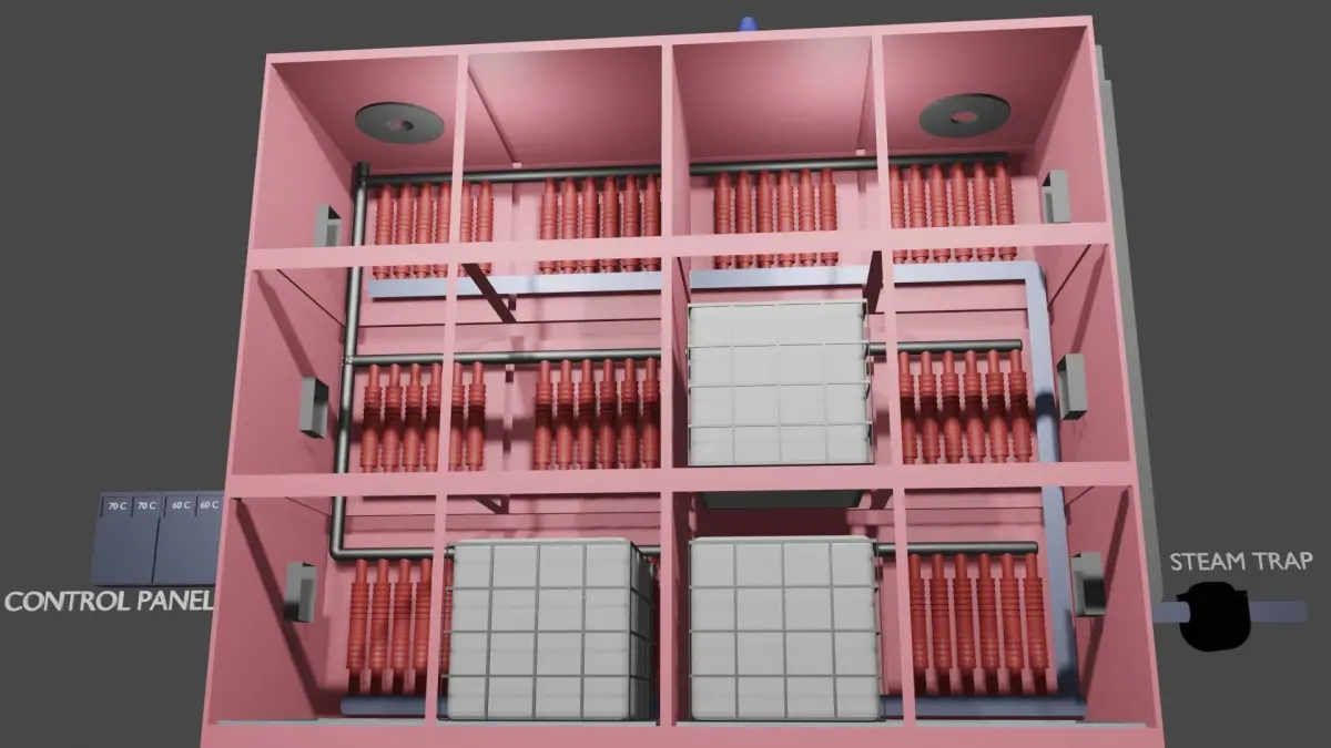 The 2 bar pressure steam move on the coils. The coils heat the air inside. Air fans on the oven circulate air inside as sucking, then the heated air passes through the air channels. Thus heating air loop happens in the oven. Here it is important to keep the temperature constant inside the oven according to need. Some chemicals that can freeze at ambient temperature are melted at constant temperature in order to get good process. 12 units of 1000 kg ibc tanks can be stocked inside to chemical melting chamber. Oven doors are made of heat-insulated sandwich panel and moves on the rail.