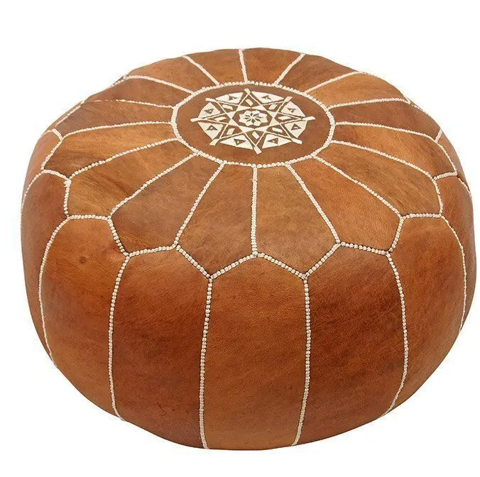 - Bring cute, casual seating to your living room or den with this playful pouf! Upholstered in rich genuine leather, this lovely pouf strikes a spherical silhouette featuring a chunky embroidered hemstitching throughout its removable outer shell for a welcome touch of texture, while polyester fill and cotton batting offer softness and support this pouf makes a perfect ottoman or can be pulled out for extra seating at your next soiree.