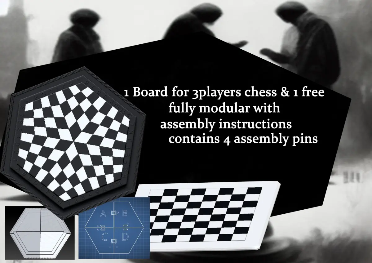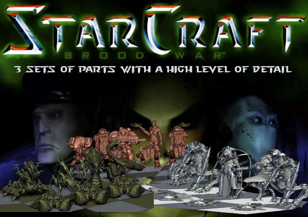 (update: add base for the pieces that need ) Three-player chess is a variant of the traditional game of chess that is played on a board divided into four quadrants. Each player controls a standard set of chess pieces in their own quadrant and can only move their pieces within their own quadrant. The game is won when a player captures the opponent's king. Because the board is divided into four quadrants, the game is more complex and requires more strategic thinking than standard chess. Each player has access only to their own quadrant, with the other quadrants being off-limits. This makes it more difficult to protect the king and creates additional challenges for players.In a three-player chess set inspired by the popular video game StarCraft, the board would likely be divided into three sections, with each player controlling a different set of chess pieces representing one of the game's three factions: the Terran, the Protoss, and the Zerg. The Terran pieces might include familiar chess pieces like the rook and knight, but with a futuristic, military-inspired design. The Protoss pieces could have a more elegant, otherworldly appearance, while the Zerg pieces might be more monstrous and alien-like. Each player would need to develop strategies to defend their own territory while also coordinating with their teammates to take on the other factions.