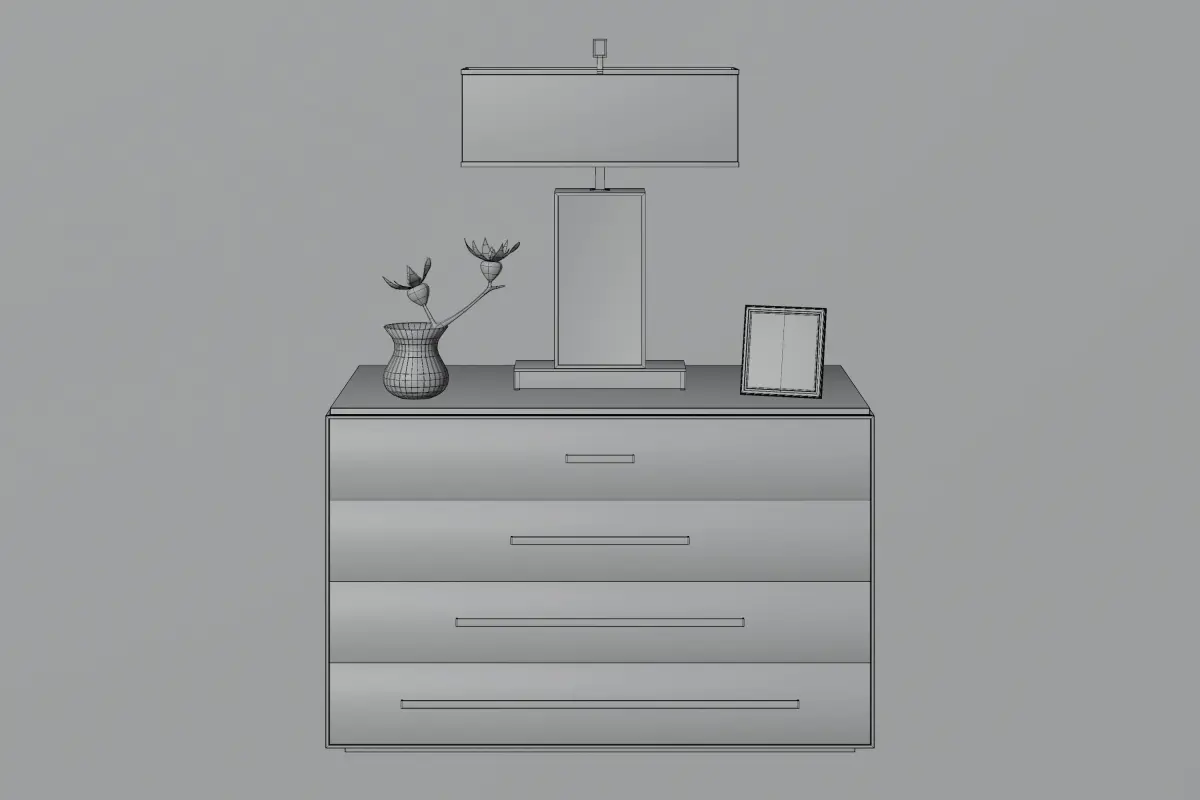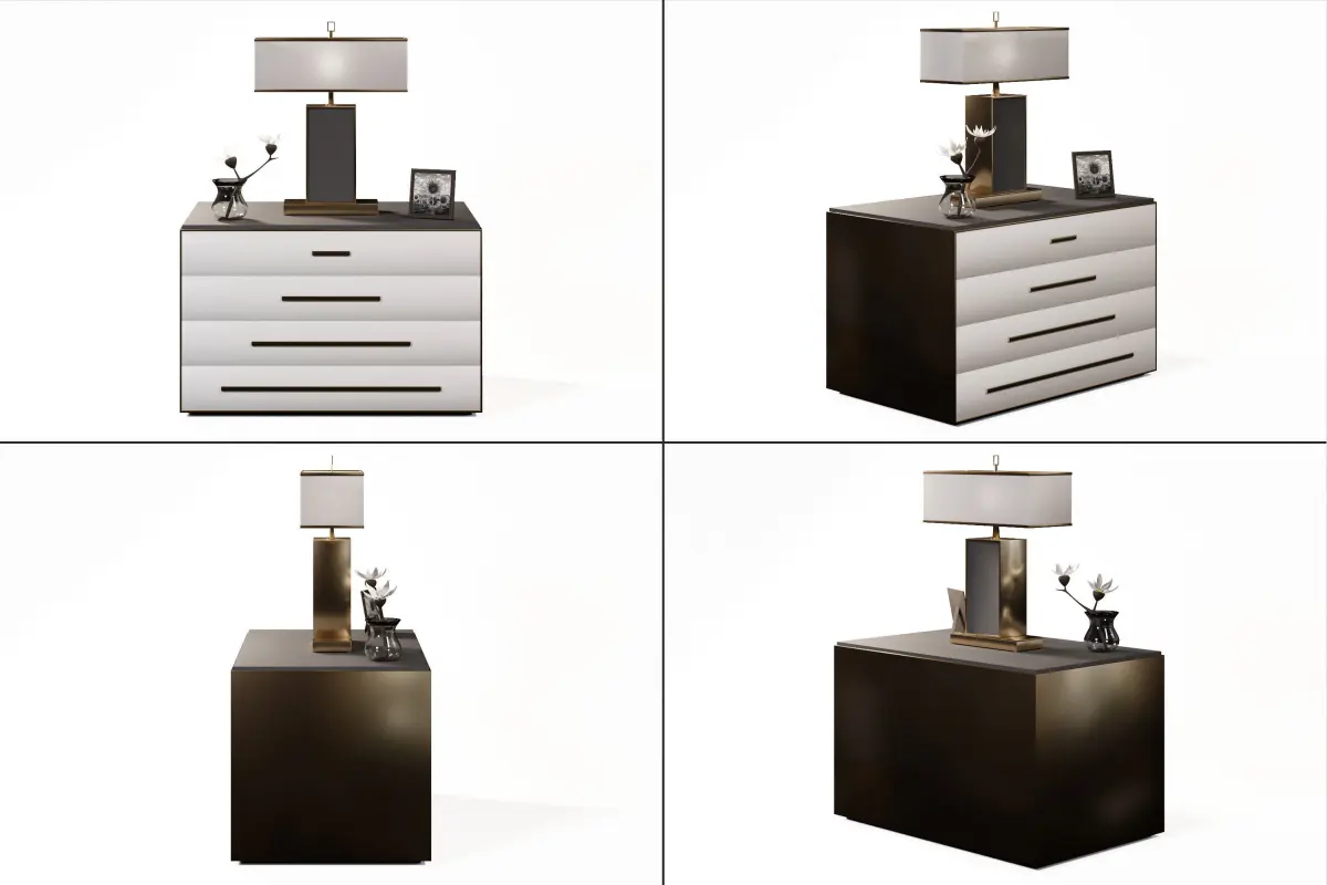 A Chest of drawers with white front, dark top and golden sides, which is suitable for both living room and bedroom with either light-colored furniture or dark-colored furniture. The drawer comes with a lamp, flowers and a framed picture on it. This project can be used in various design projects where furniture is needed, as well as in interior architecture projects or computer games when furniture items with modern and luxurious design are needed. The project was modeled in Blender