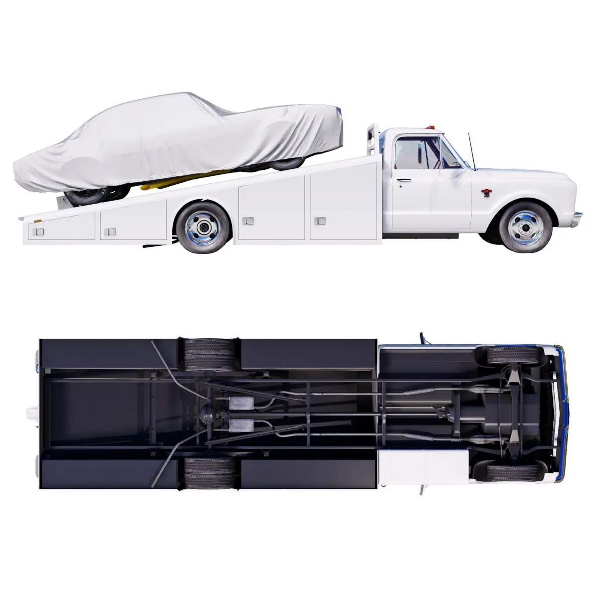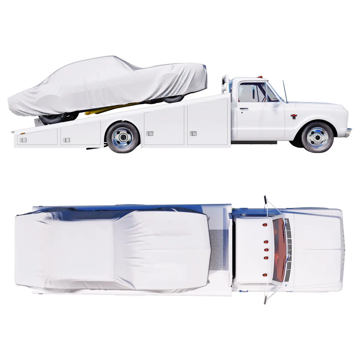 Attention! In this model there is NO model of the transported car under the cover, only wheels.