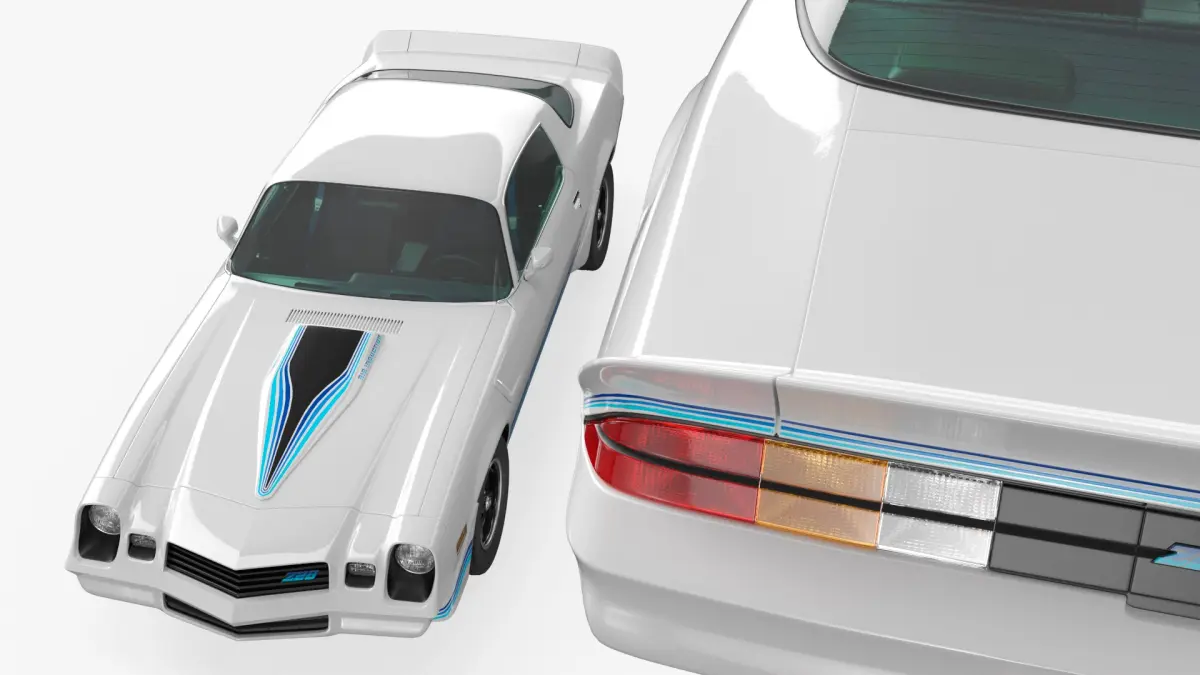 Chevrolet Camaro Z28 Retro Sports Car White Rigged for Cinema 4D is a three-dimensional model of classic American muscle car, that is a mid-size American automobile manufactured by Chevrolet, classified as a pony car.
