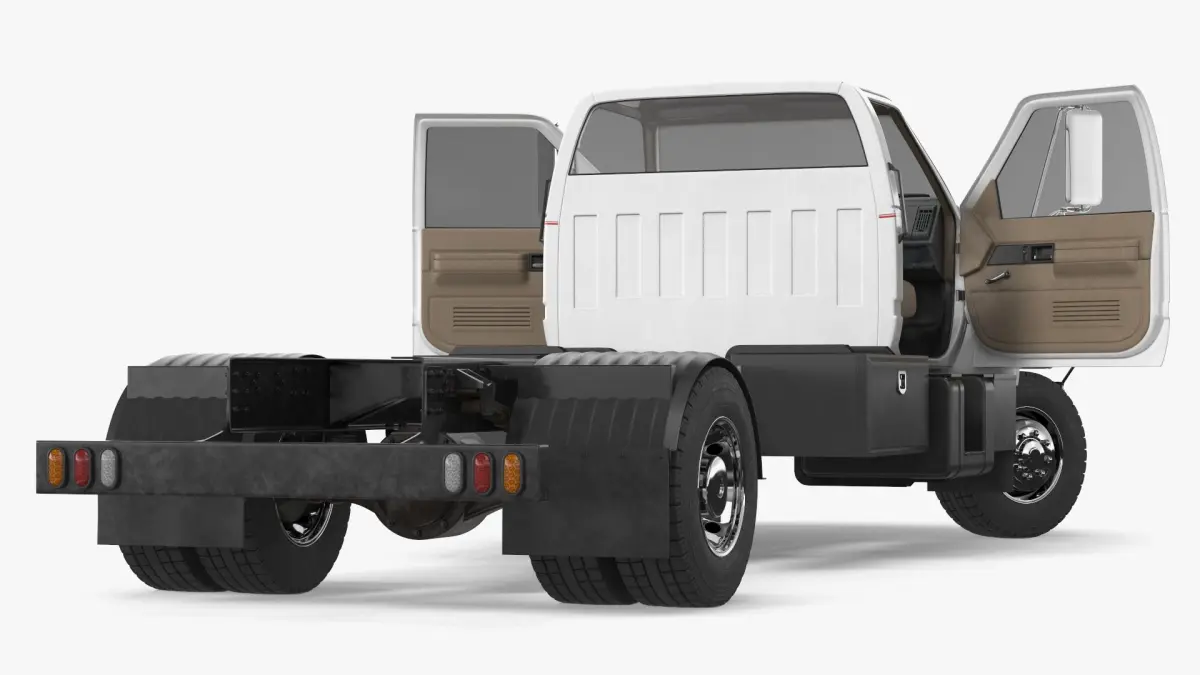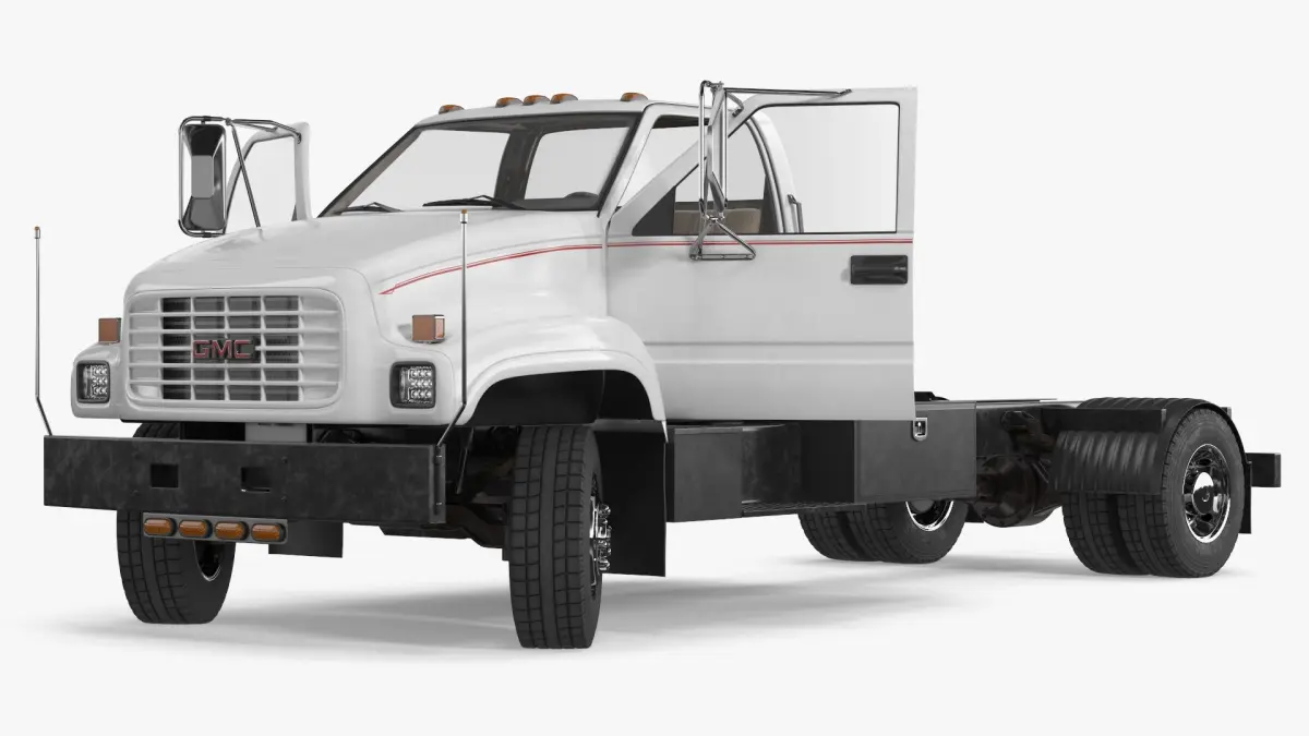 Chevrolet Kodiak C6500 Commercial Cab Chassis White Rigged for Maya is a 3d model of a medium-duty truck chassis, showcasing its essential frame structure without an attached body.