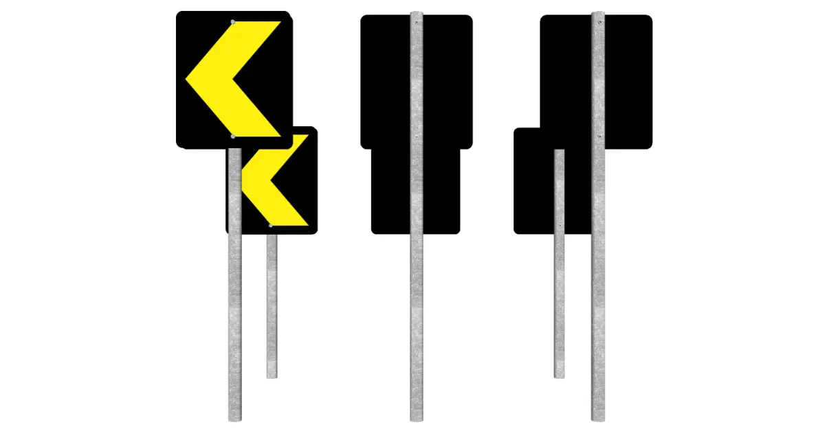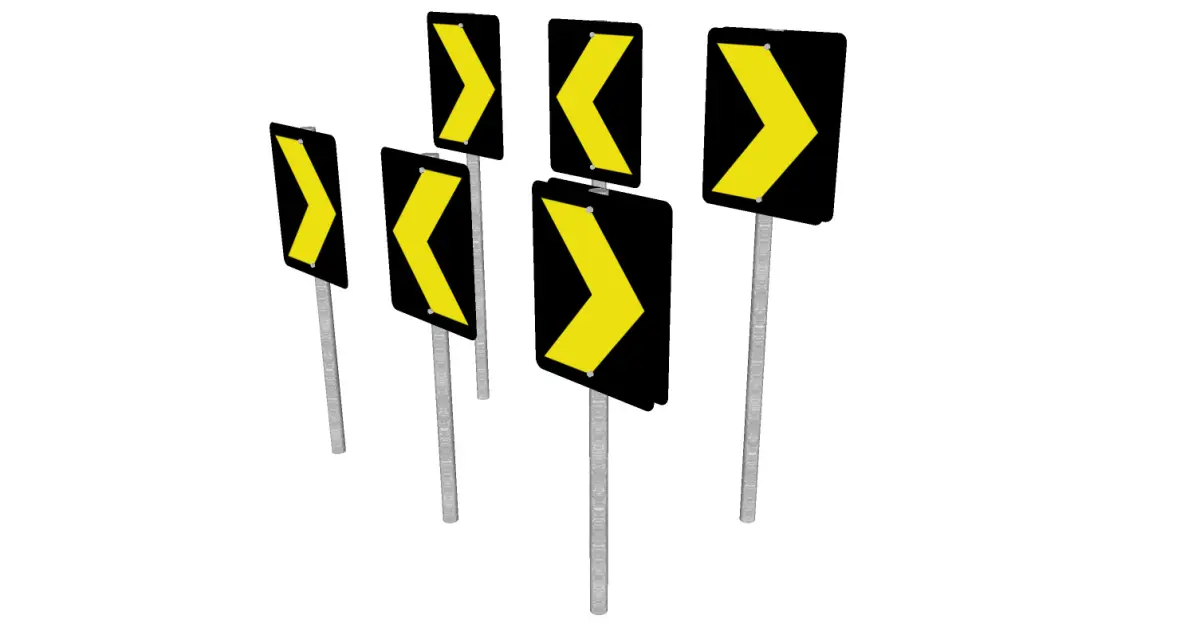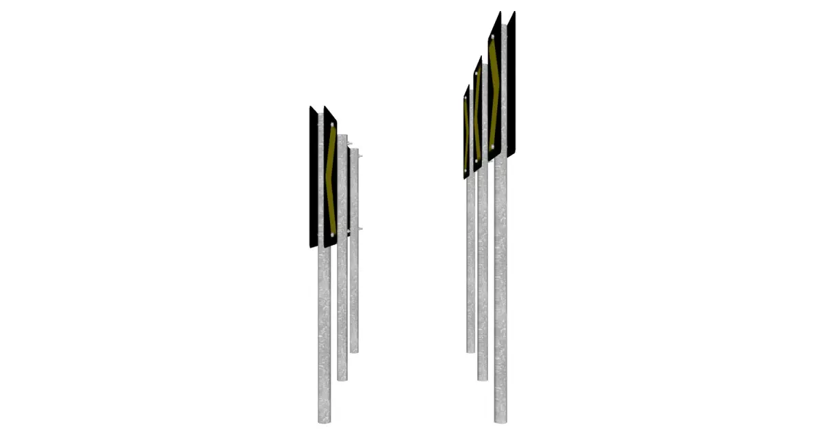 The alignment marker alerts the vehicle driver to changes in the horizontal alignment of the road. It consists of a plate affixed to a support with an arrowhead inscribed on it, indicating the direction of the change in the alignment of the lane in that section of the road.