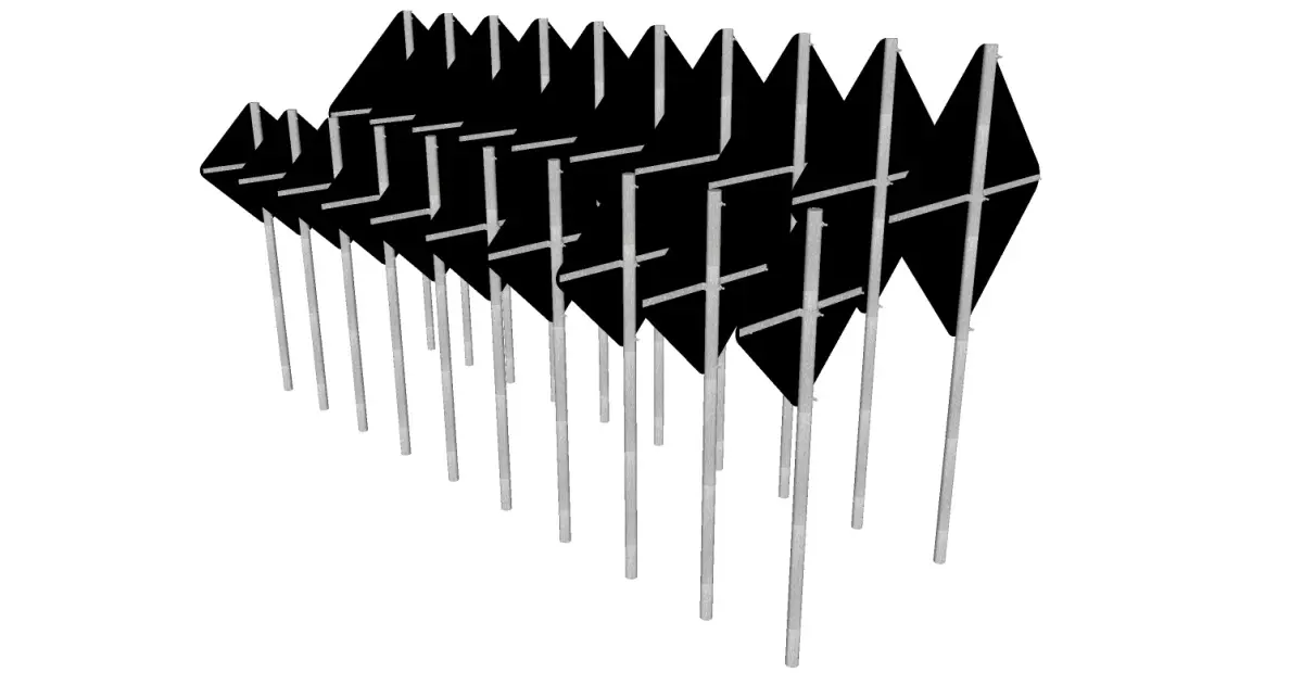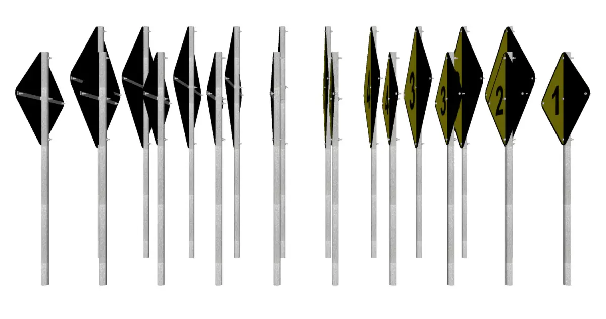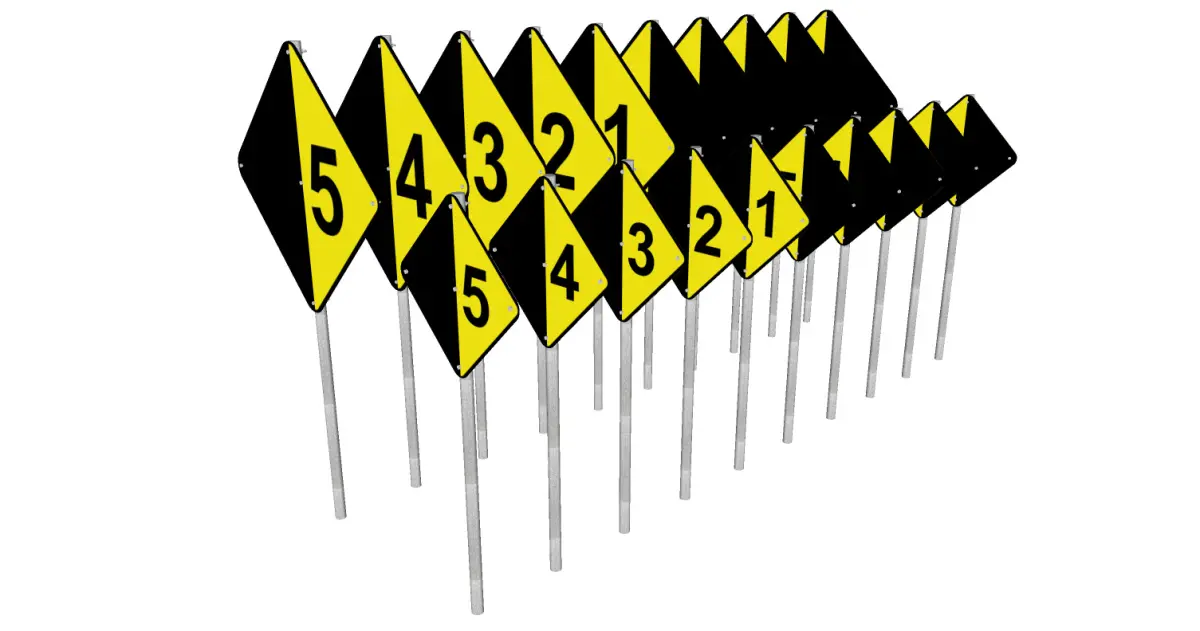 Sign indicating a sharp curve ahead, numbered 5, 4, 3, 2, 1, to place the sides of a highway with many curves in descending order. When the driver passes these 5 signs in sequence, he will know that there is a curve ahead, either to the right or left.