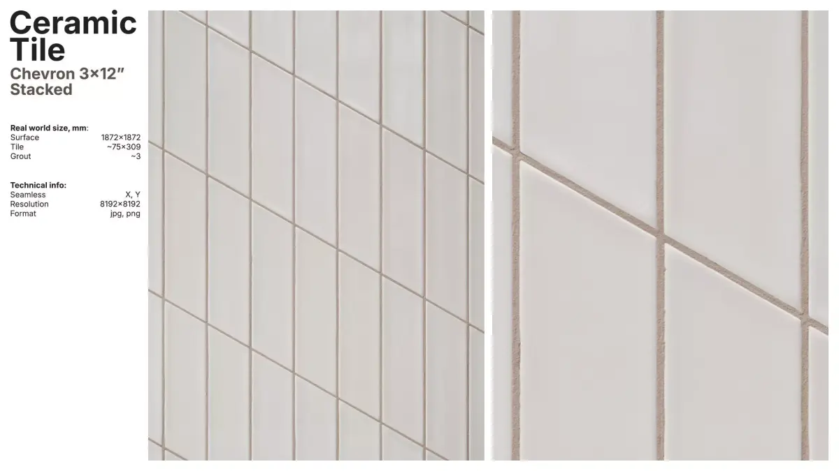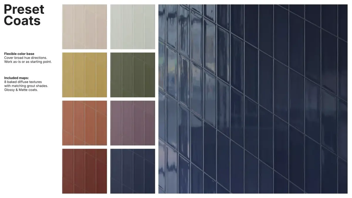 The package includes 8 diffuse variations with matching grout tones, and a flexible color base that works out-of-the-box or as a starting point for custom looks.