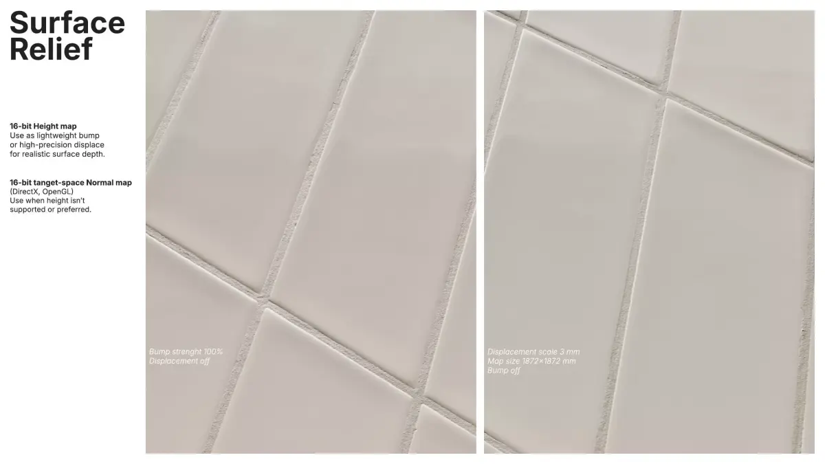 Surface relief is provided by a RAW 16-bit height map tuned for a true 3 mm depth (1872x1872 mm surface), suitable for lightweight bump or precise displacement. A 16-bit tangent-space normal map (DirectX/OpenGL) is included for cases where height-based workflows aren’t preferred.