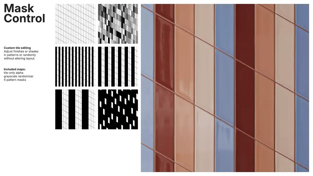 Pattern and random masks allow independent control of tile and grout colors, enabling global, per-pattern or per-tile adjustments without disturbing the layout. Tile-only alpha, a grayscale randomizer and pattern masks ensure full customization for complex designs.