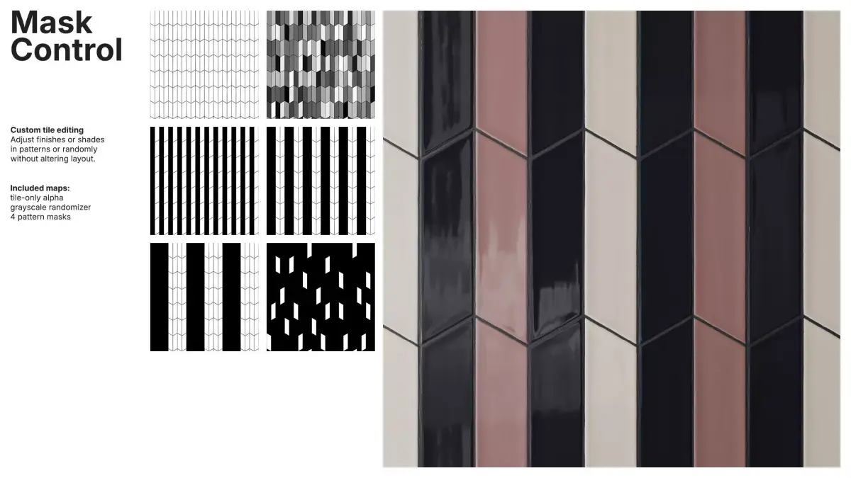 Pattern and random masks allow independent control of tile and grout colors, enabling global, per-pattern or per-tile adjustments without disturbing the layout. Tile-only alpha, a grayscale randomizer and pattern masks ensure full customization for complex designs.