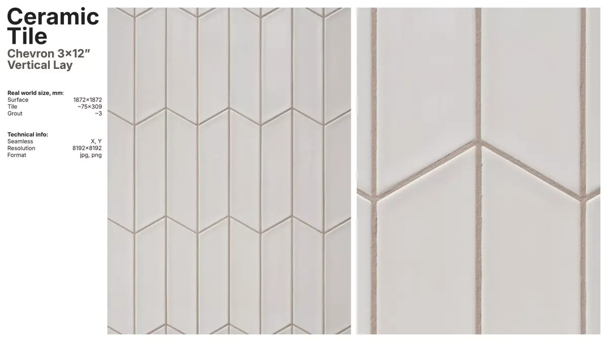 Glazed artisan ceramic tile material in a chevon 3x12 inch format arranged in a vertical layout.
