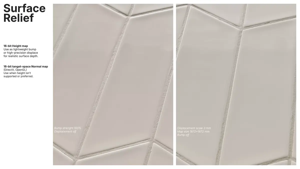 Surface relief is provided by a RAW 16-bit height map tuned for a true 3 mm depth (1872x1872 mm surface), suitable for lightweight bump or precise displacement. A 16-bit tangent-space normal map (DirectX/OpenGL) is included for cases where height-based workflows aren’t preferred.