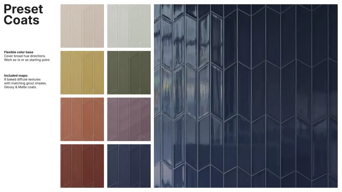 The package includes 8 diffuse variations with matching grout tones, and a flexible color base that works out-of-the-box or as a starting point for custom looks.