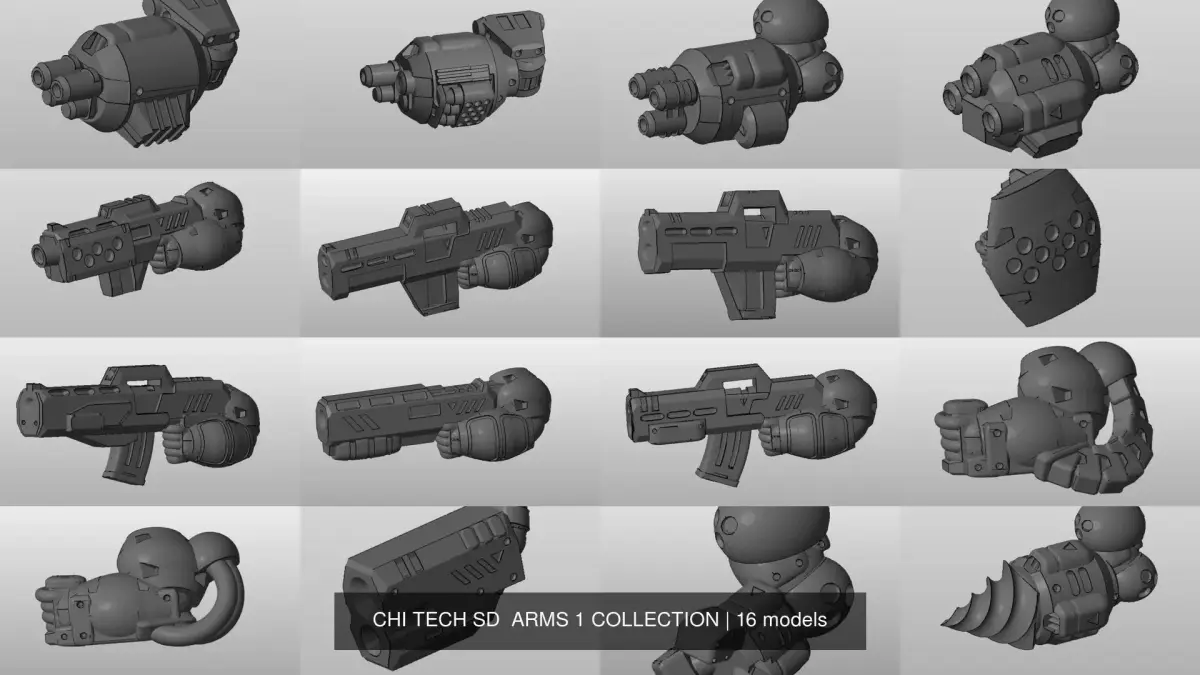 This file pack contains the FULL SERIES-1 COLLECTION of ARMS MODULES from the CHIBI-TECH SD lineup, plus ALTS, and ALL STAT CARDS for the included Modules.CONTAINS 16 INDIVIDUAL FILE PACKS, each containing the original sculpt and numerous alternate designs in single-piece file format and FDM-optimized formats of each model within. Includes all LEFT and RIGHT hand models and variants.