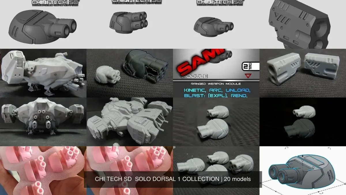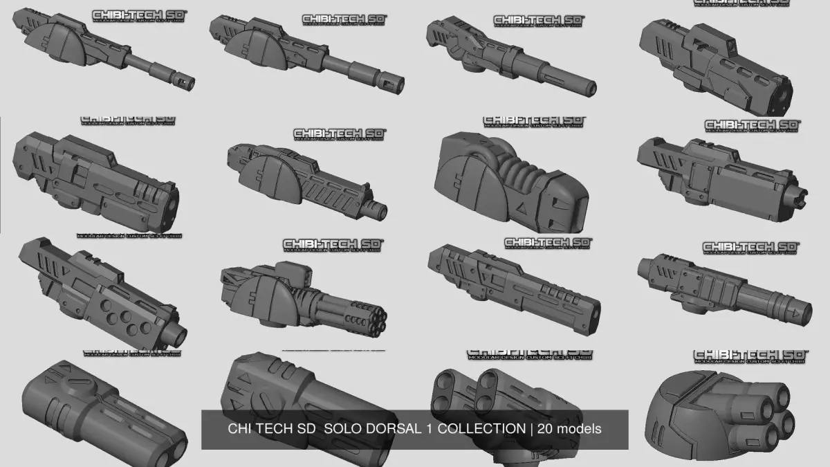 This file pack contains the FULL SERIES-1 COLLECTION of SOLO-DORSAL MODULES from the CHIBI-TECH SD lineup, plus ALTS, and ALL STAT CARDS for the included Modules.